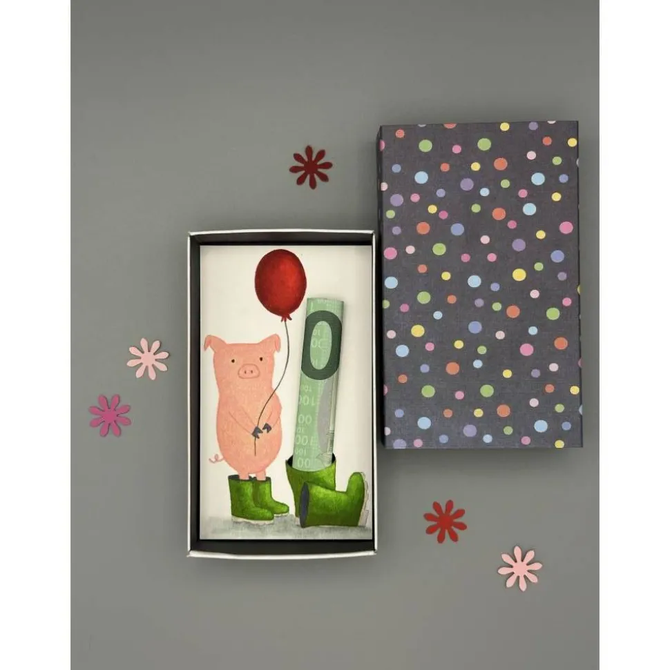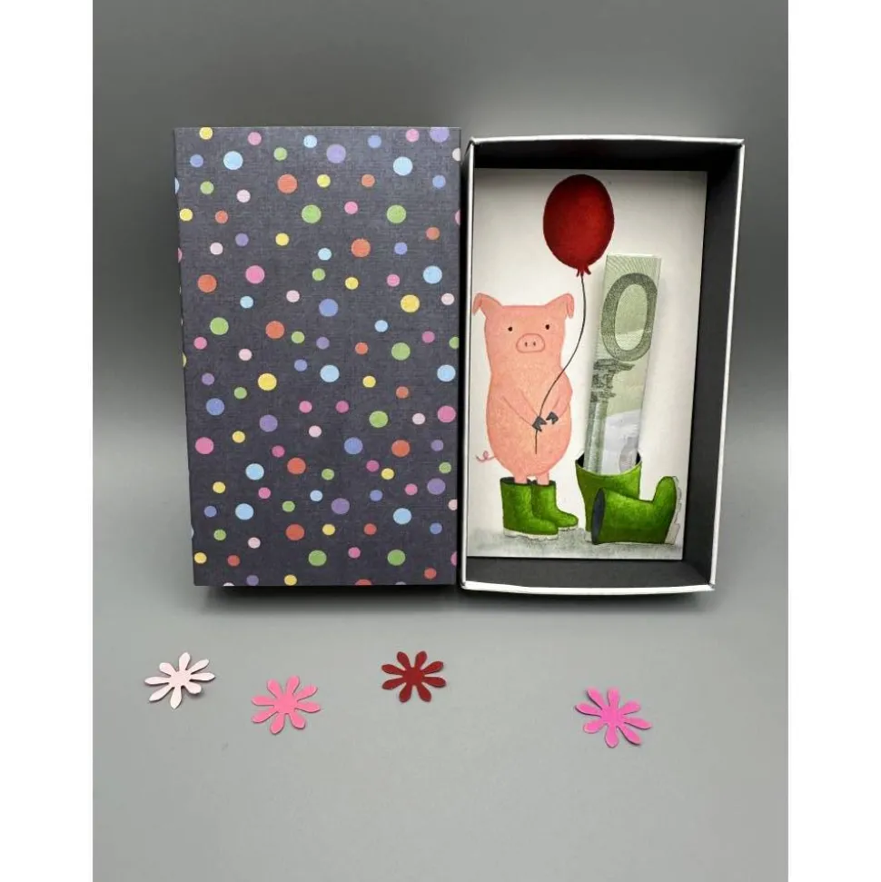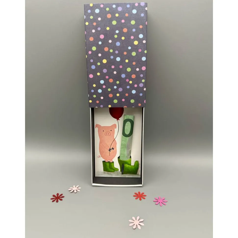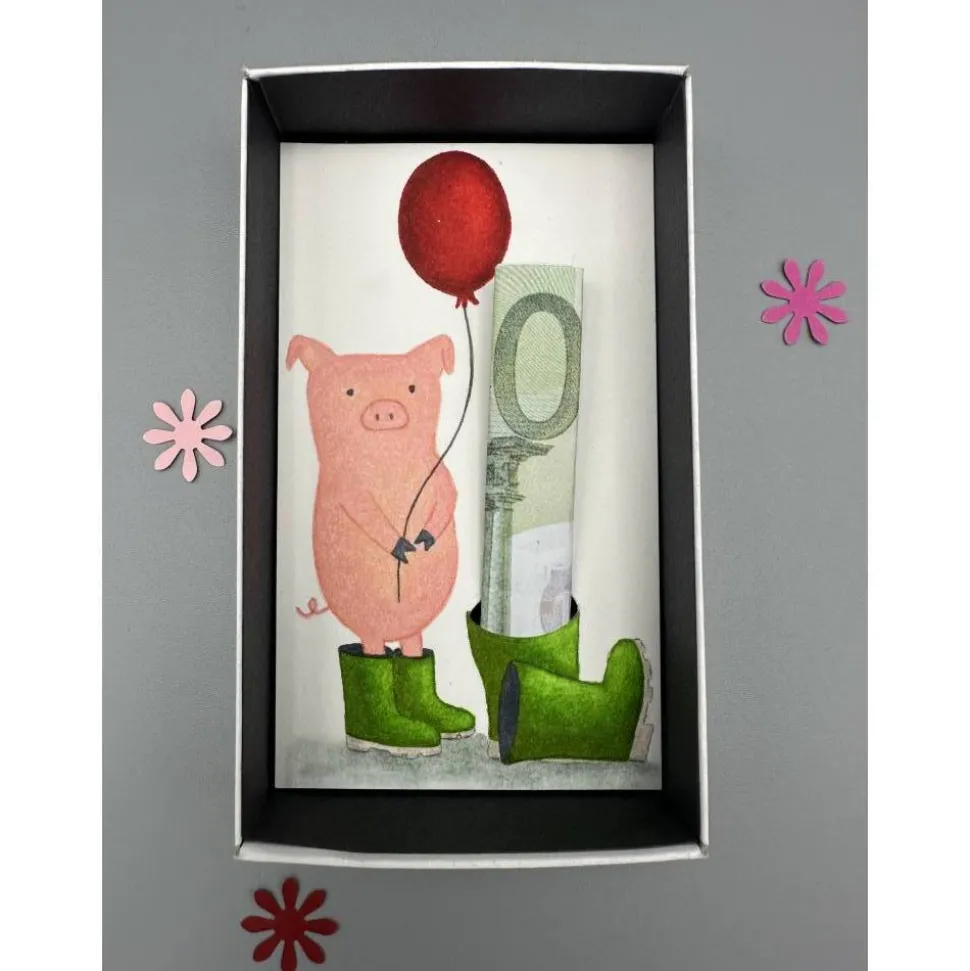 Mit dieser einzigartigen Geschenkbox verpackst du dein Geldgeschenk auf eine besonders lustige und kreative Art. Im Innenteil der Schachtel erwartet dich ein handgemaltes rosa Schweinchen in grünen Gummistiefeln, das einen roten Luftballon hält. Direkt daneben findest du weitere Gummistiefel – einer davon mit einem eingestanzten Loch, perfekt für deinen Geldschein oder einen selbstgestalteten Gutschein.