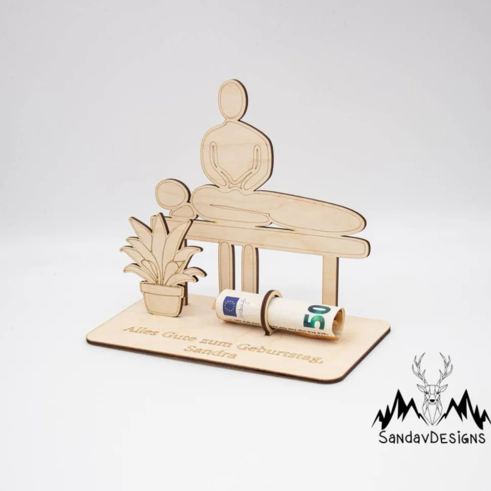 Auf der Suche nach dem perfekten, individuellen Geschenk? Entdecken Sie unser handgefertigtes Geldgeschenk aus 3mm dickem Birkensperrholz, das mit Präzision und Liebe zum Detail mit Laser hergestellt wurde. Dieses einzigartige Kunstwerk, inspiriert vom friedlichen und erneuernden Geist eines Wellnessurlaubs, ist das ideale Geschenk für alle, die Entspannung und Erholung schätzen.