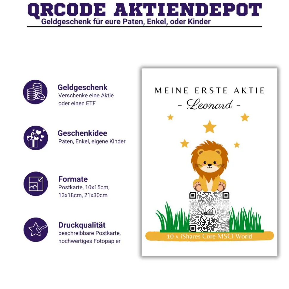Geldgeschenk | Meine Erste Aktie | Personalisierte Aktie ETF Kryptowährung QrCode Geschenkkarte | Motiv Löwe