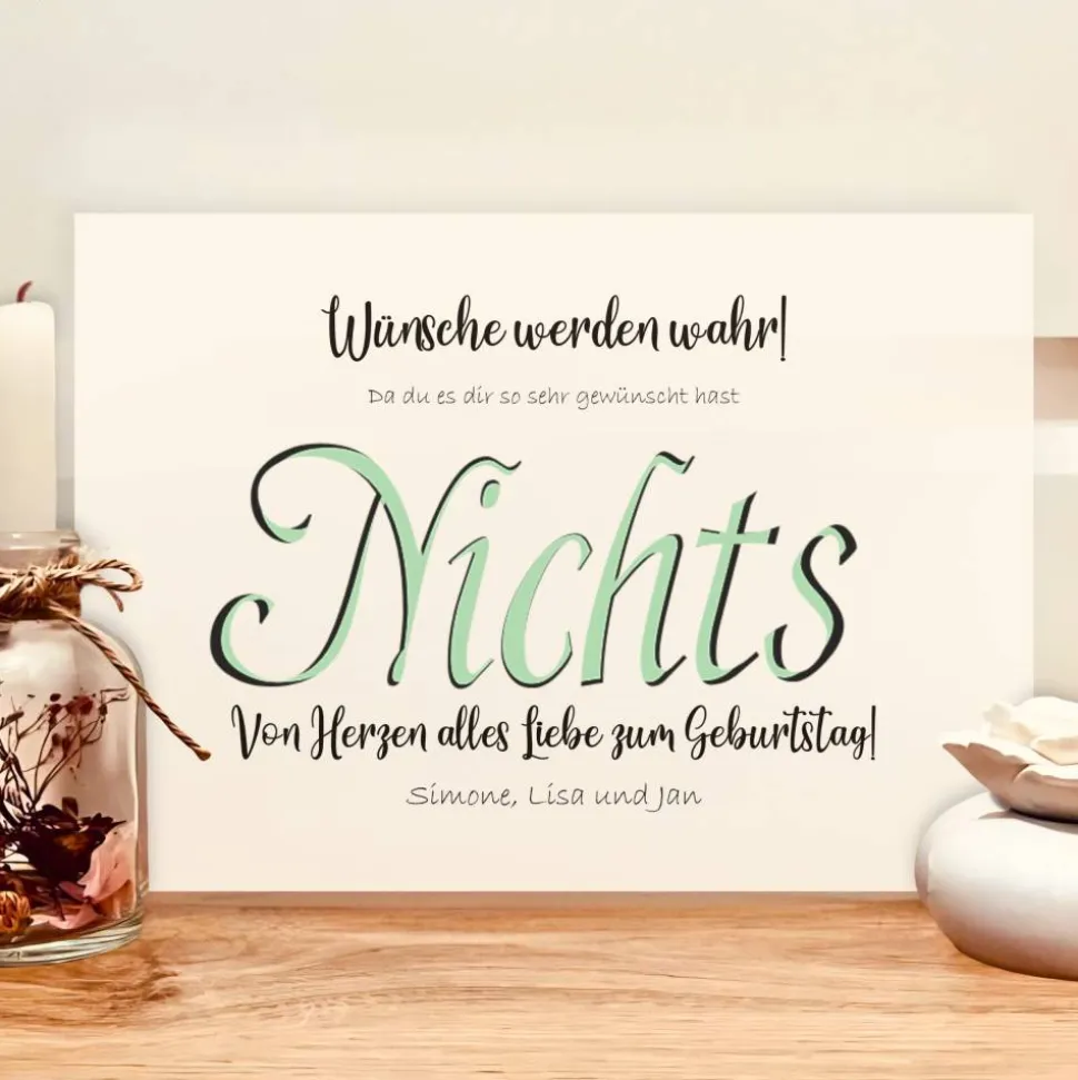 - Das A4-Geldgeschenk (Format: 21 × 29,7 cm) bietet Platz für eine Finanzspritze oder einen Gutschein – einfach hinter dem Wort „NICHTS“ platzieren.