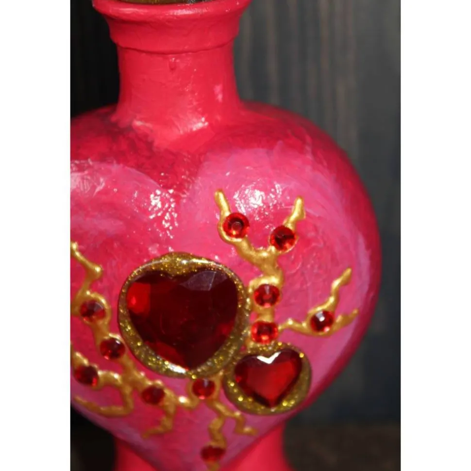 Witzige Gestaltung aus einer herzförmigen Glasflasche. Upcycling-Projekt, gestaltet mit Acrylfarbe und Glitzersteinen. Kann als Geldgeschenk verwendet werden, indem man einen Geldschein oben in den Notizhalter klammert, siehe Beispielfoto. Auch für einen kleinen Liebesbrief oder Wellnessgutschein ist hier Platz :)!