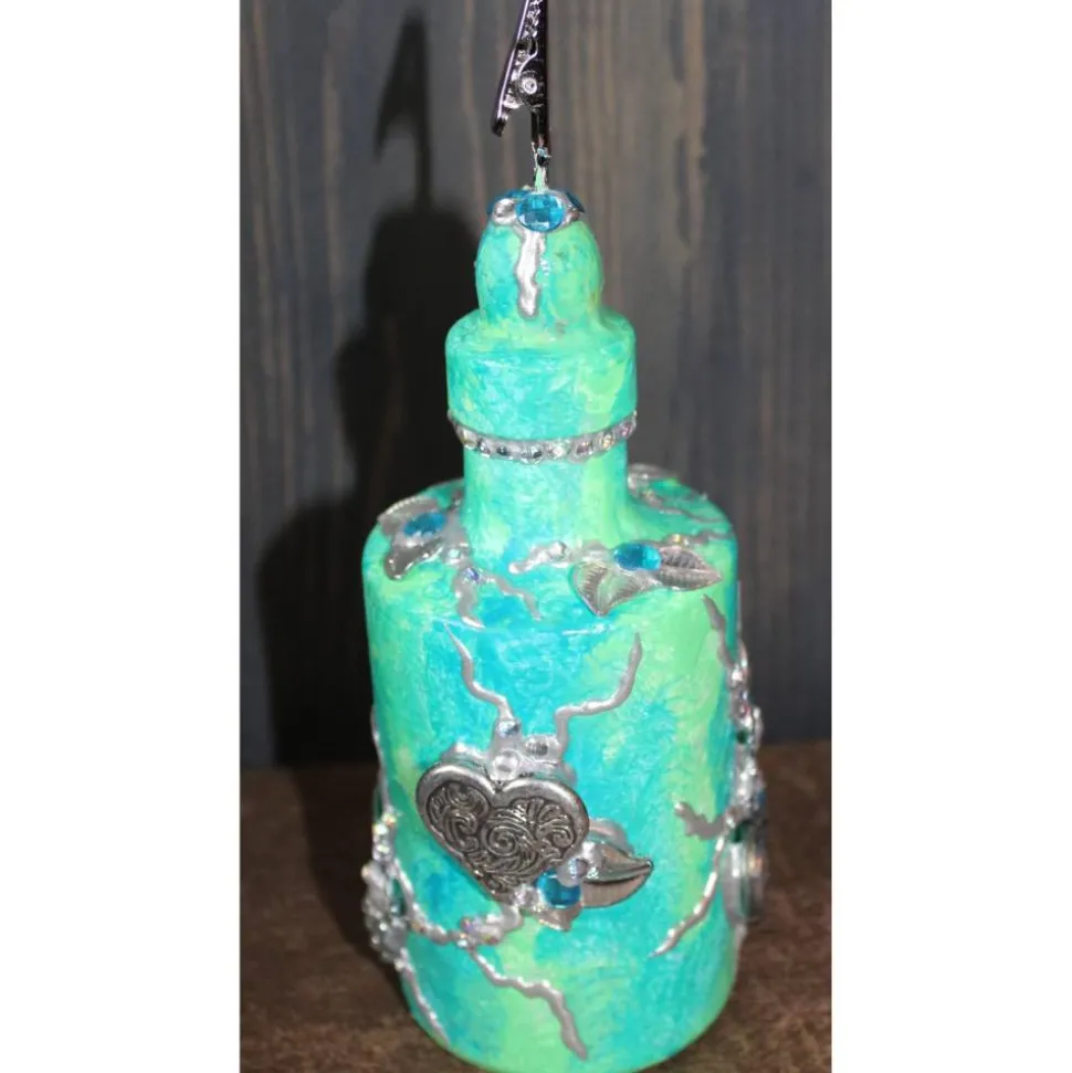 Witzige Gestaltung aus einer kleinen Glasflasche. Upcycling-Projekt, gestaltet mit Acrylfarbe und Applikationen aus Kunststoff. Dekoriert mit Glitzersteinen. Kann als Geldgeschenk verwendet werden, indem man einen Geldschein oben in den Notizhalter schiebt. Auch für einen kleinen Liebesbrief oder Wellnessgutschein in Scheckkartengröße ist hier Platz :)!