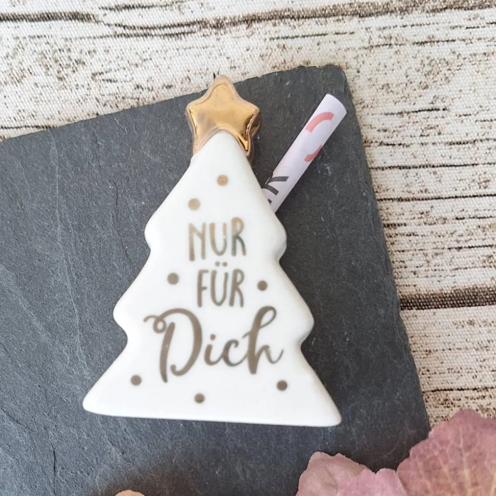Der niedliche Porzellan-Tannenbaum ist mit goldfarbener Schrift bedruckt und bietet Platz für einen gerollten Geldschein. Geliefert wird er in einer goldenen Geschenkverpackung.