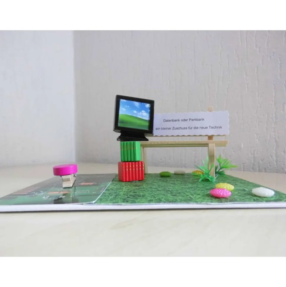 Diese liebevoll gestaltete Geschenkidee vereint Technik und Natur: Auf einem Leinwandkarton dekorierst du ein kleines Idyll mit einer Parkbank und einem PC-Monitor. Die Platte ist zur Hälfte mit Papier im Rasenmotiv und dem Innenleben eines PCs beklebt und wird durch kreative Deko-Elemente wie Bücher und das Schild Datenbank oder Parkbank ergänzt.