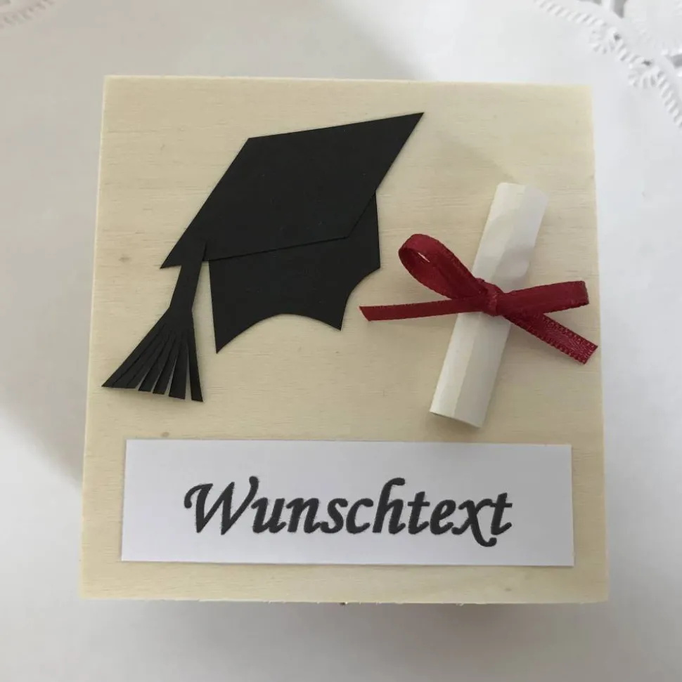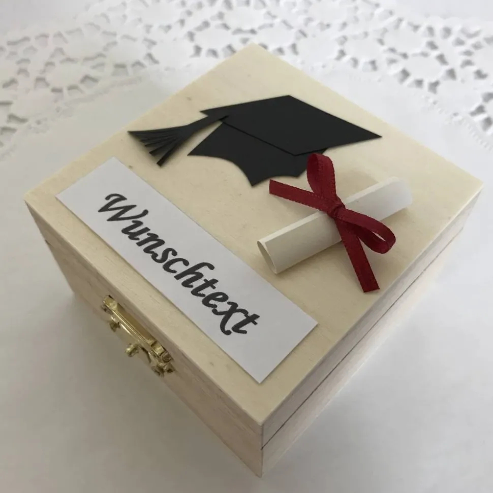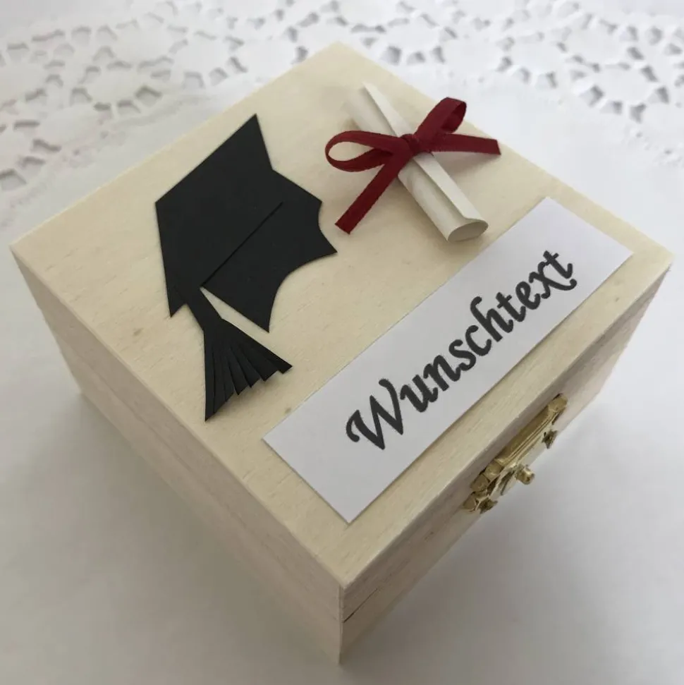 Die Holz-Box ist hübsch dekoriert mit Doktorhut sowie Abschluss-Zeugnis und sowohl für den Mann als auch die Frau geeignet. In der praktischen Schatulle aus Holz lässt sich Geld in Münzen oder Scheinen ebenso als Geschenk überreichen wie ein Gutschein. Besonderes Highlight ist das Schild mit Wunschtext wodurch das Geldgeschenk noch persönlicher gestaltet werden kann.