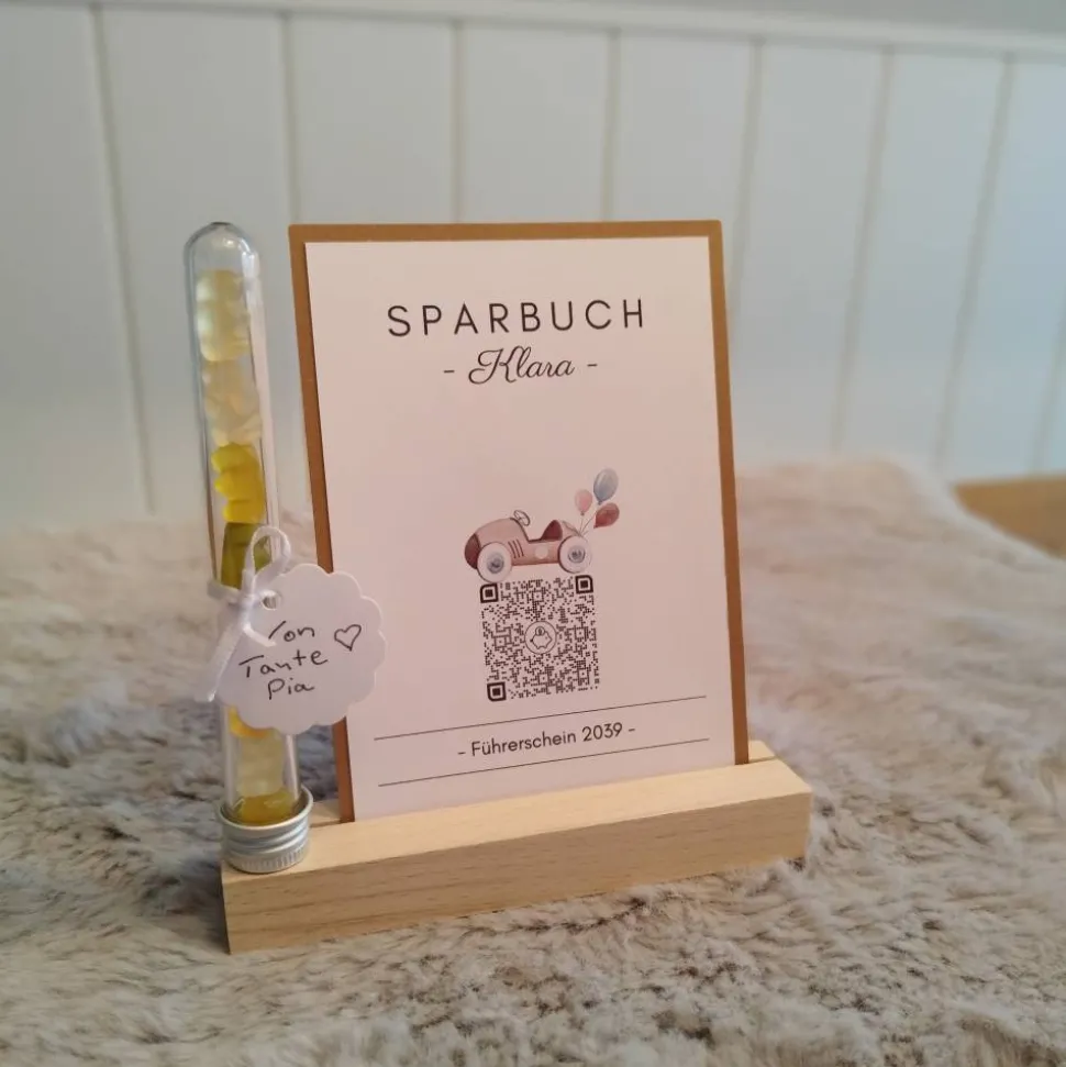Schreibe die erste Bewertung für „Geldgeschenk Personalisiert | Virtuelles Sparbuch | QrCode Geschenkkarte inklusive Reagenzglas und Kartenständern | Auto“ Antworten abbrechen