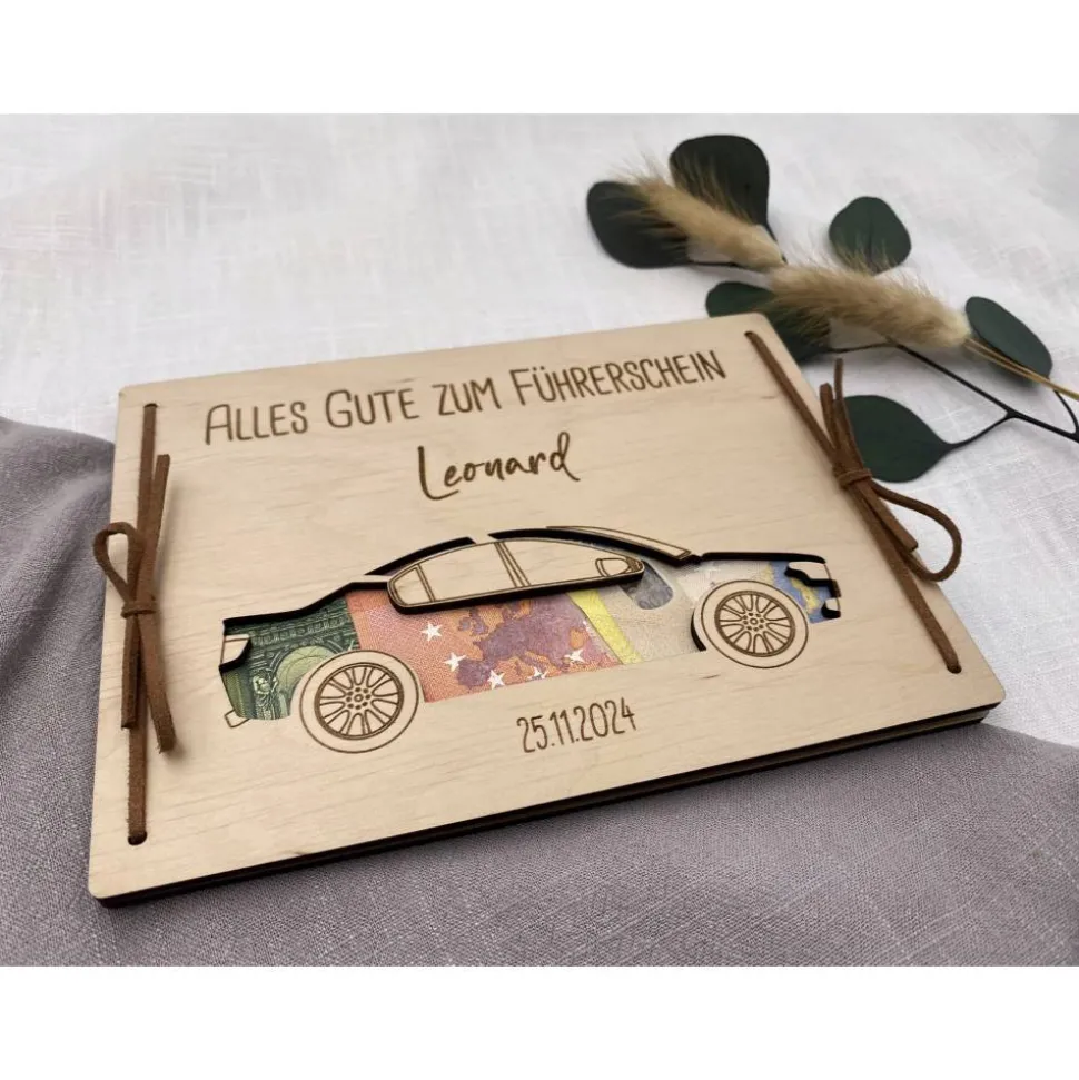 Für das Geldgeschenk nutzen wir 100% FSC zertifiziertes Pappelsperrholz, welches 3mm dick ist und wird inklusive Kunstlederband zum zubinden geliefert.
