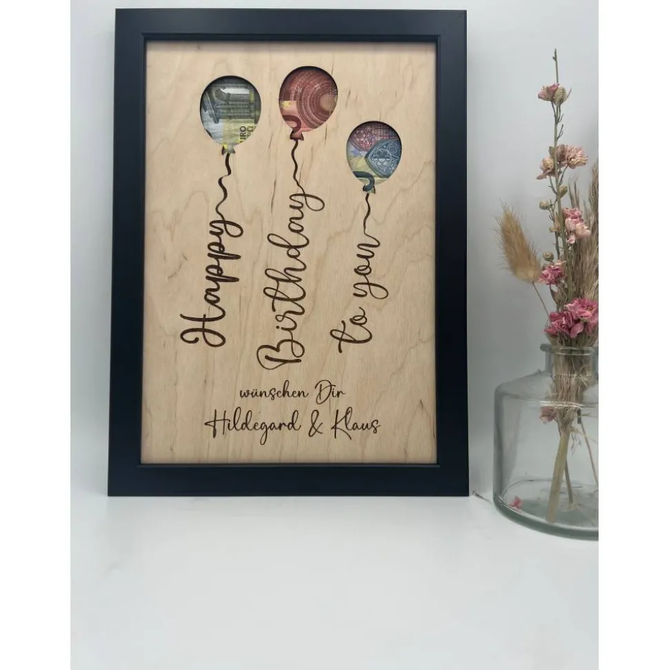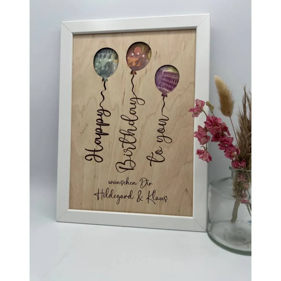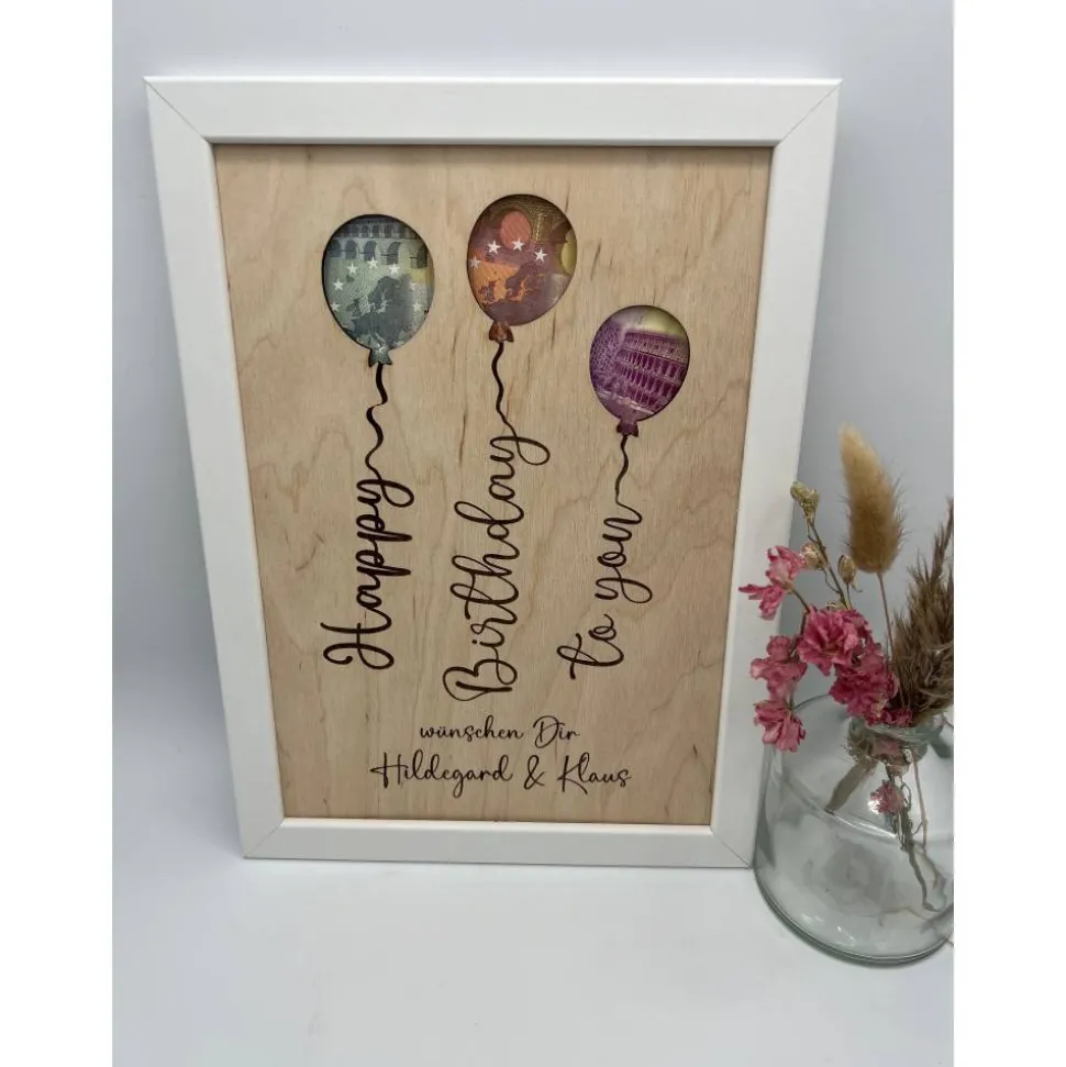 Der dekorative Rahmen bietet dir eine originelle Verpackung für Geldscheine, Gutscheine oder Tickets, die du ganz einfach hinter den liebevoll gestalteten Luftballons platzieren kannst. So wird dein Geschenk nicht nur persönlich, sondern auch zu einem einzigartigen Andenken.