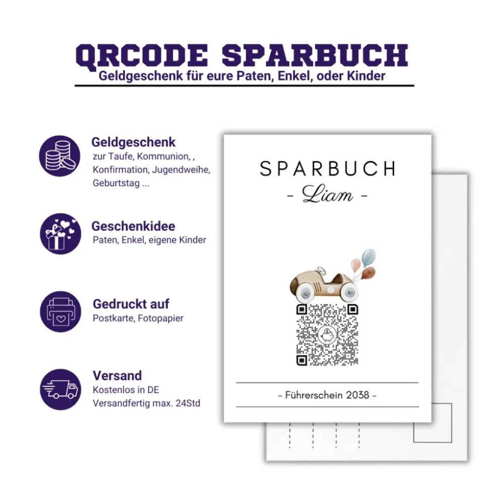 Geldgeschenk | Personalisiertes Sparbuch | QrCode Postkarte DIN A6 inkl. Briefumschlag & Anhänger | Führerschein
