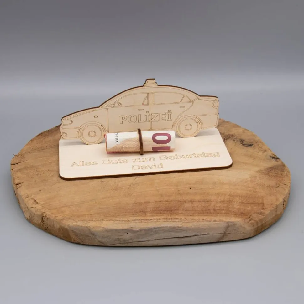 Geldgeschenk Polizeiauto - aus Holz personalisiert