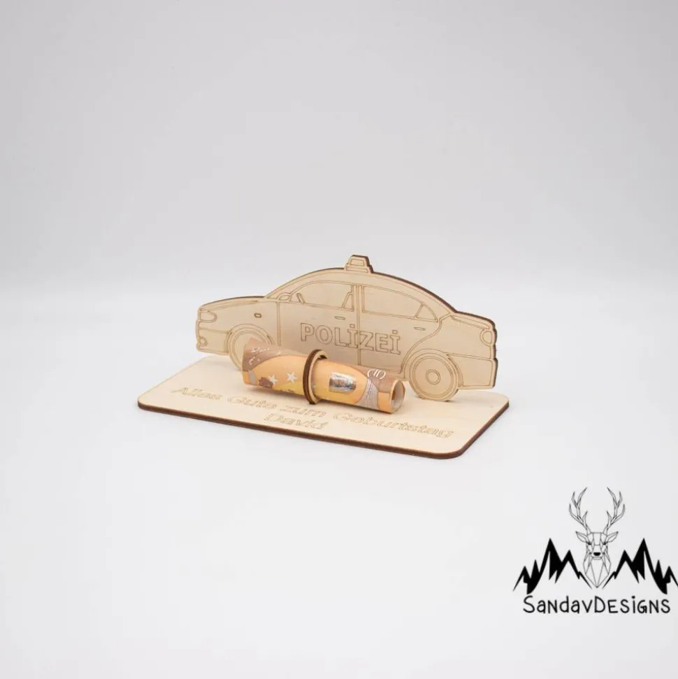 Geldgeschenk Polizeiauto – aus Holz personalisiert