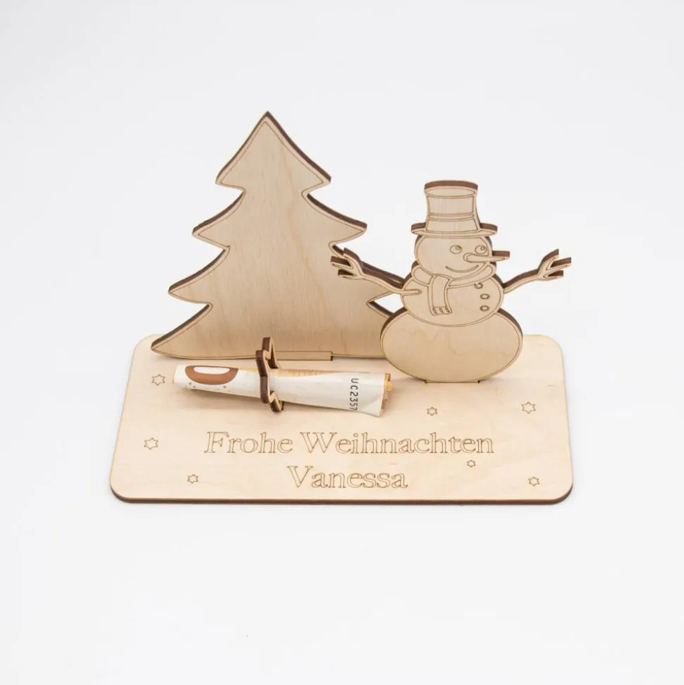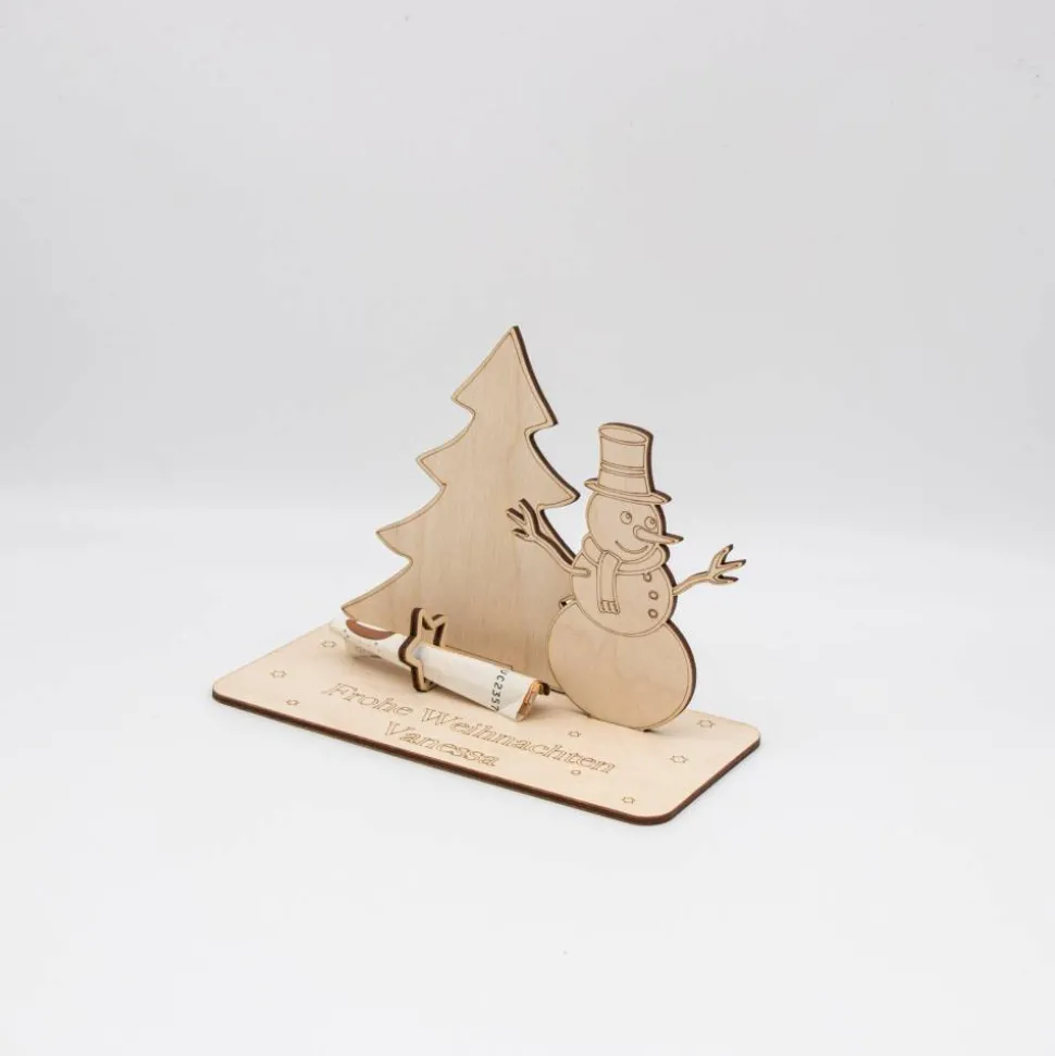 Geldgeschenk Schneemann mit Tannenbaum – aus Holz personalisiert