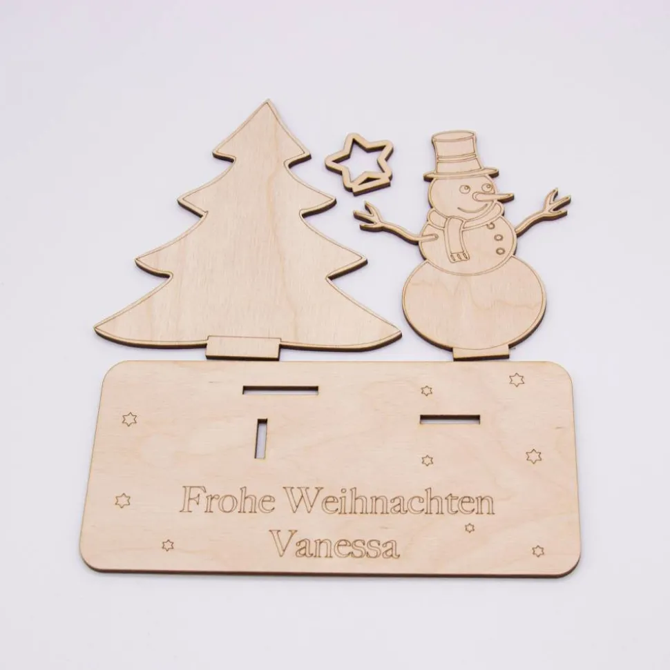 Suchen Sie nach einem einzigartigen und persönlichen Weg, Geld zu Weihnachten zu verschenken? Entdecken Sie unser exklusives Geldgeschenk aus hochwertigem, 3 mm dickem Birkensperrholz, präzise und detailgetreu mit einem Laser geschnitten.