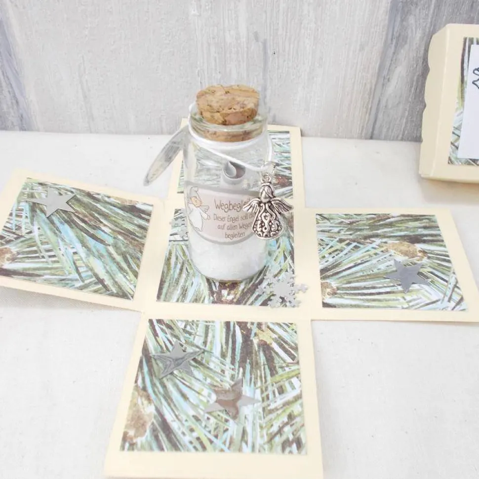 Material: Papier in verschiedene Farben und Mustern, Wunschglas mit Engel