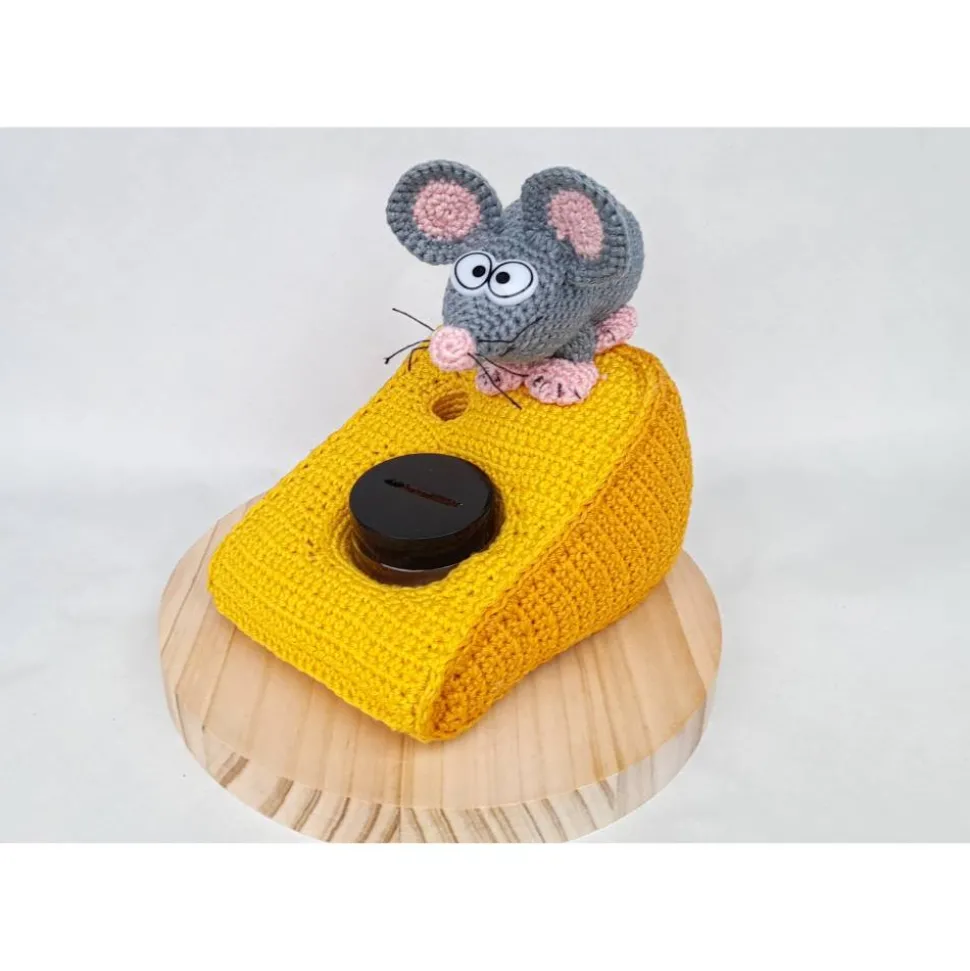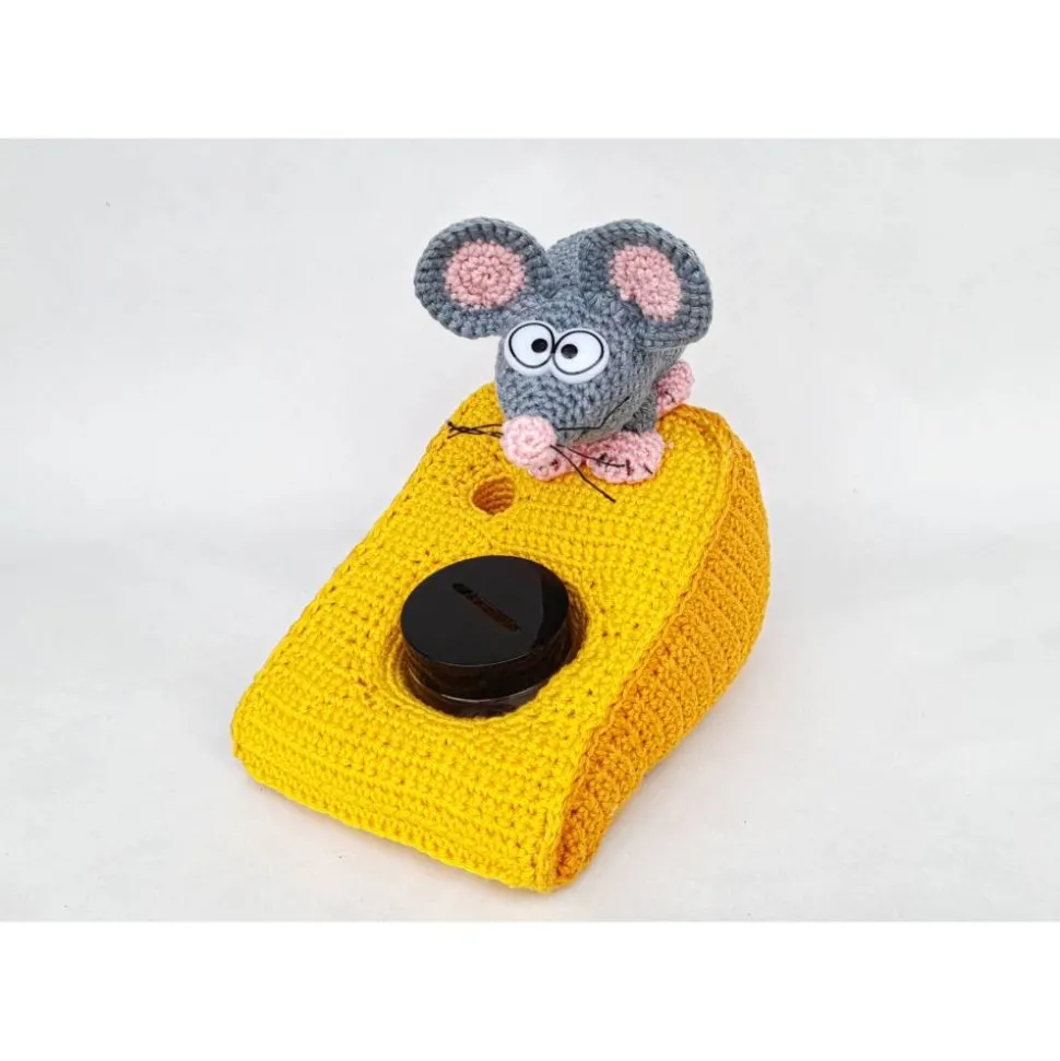 Die Holzplatte hat einen Durchmesser von ca. 21 cm und eine Gesamthöhe von ca. 18 cm. Die Spardose aus Kunststoff mit Drehverschluss misst ca. 5×5 cm und lässt sich zum Befüllen und Entnehmen ganz einfach herausnehmen. Maus und Käse sind aus 100 % Baumwolle gehäkelt, mit Füllwatte gefüllt und fest auf der Platte befestigt. Die Maus bekommt Schnurhaare und lustige Kunststoffaugen, die für einen besonderen Charme sorgen.