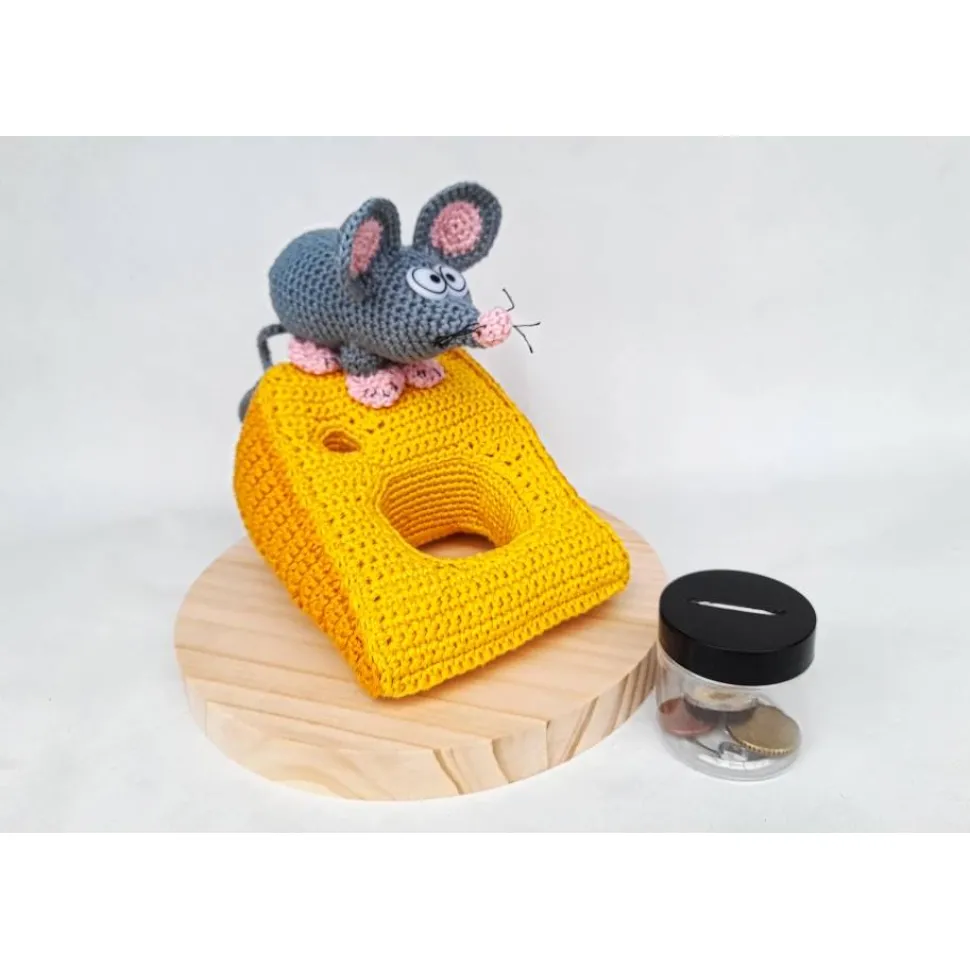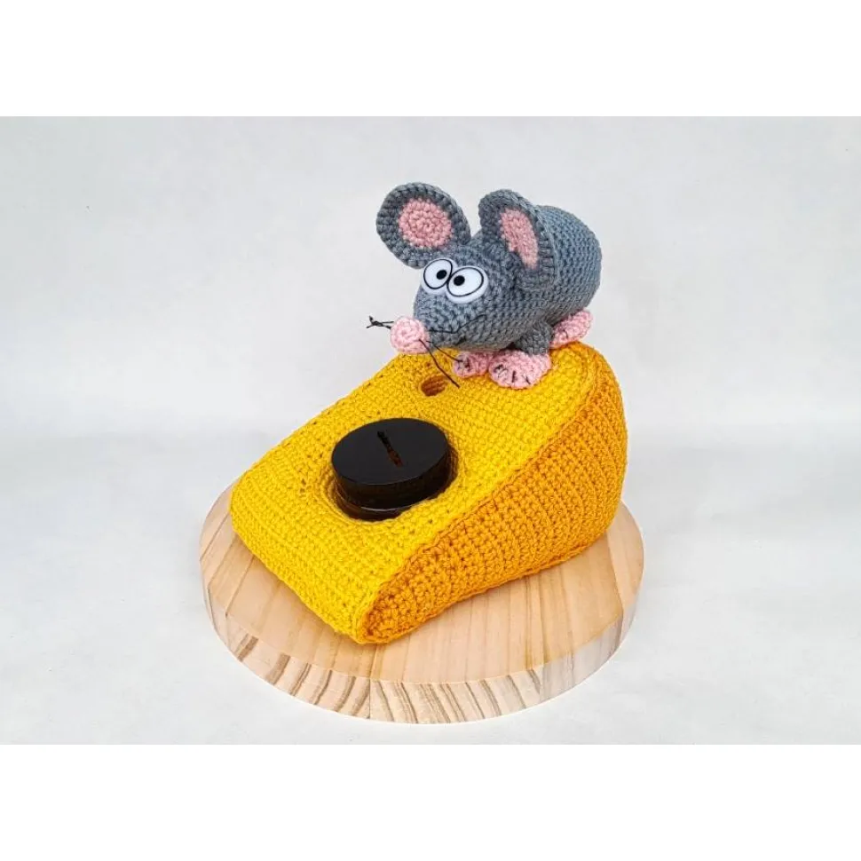 Verschenke Geld oder Gutscheine auf einzigartige Weise! Mit dieser liebevoll handgefertigten Spardose in Form einer süßen Amigurumi Maus mit Käse auf einer Holzplatte machst du jedes Geldgeschenk zum echten Hingucker.
