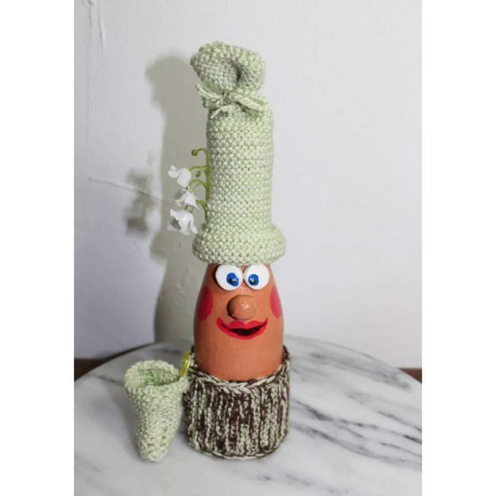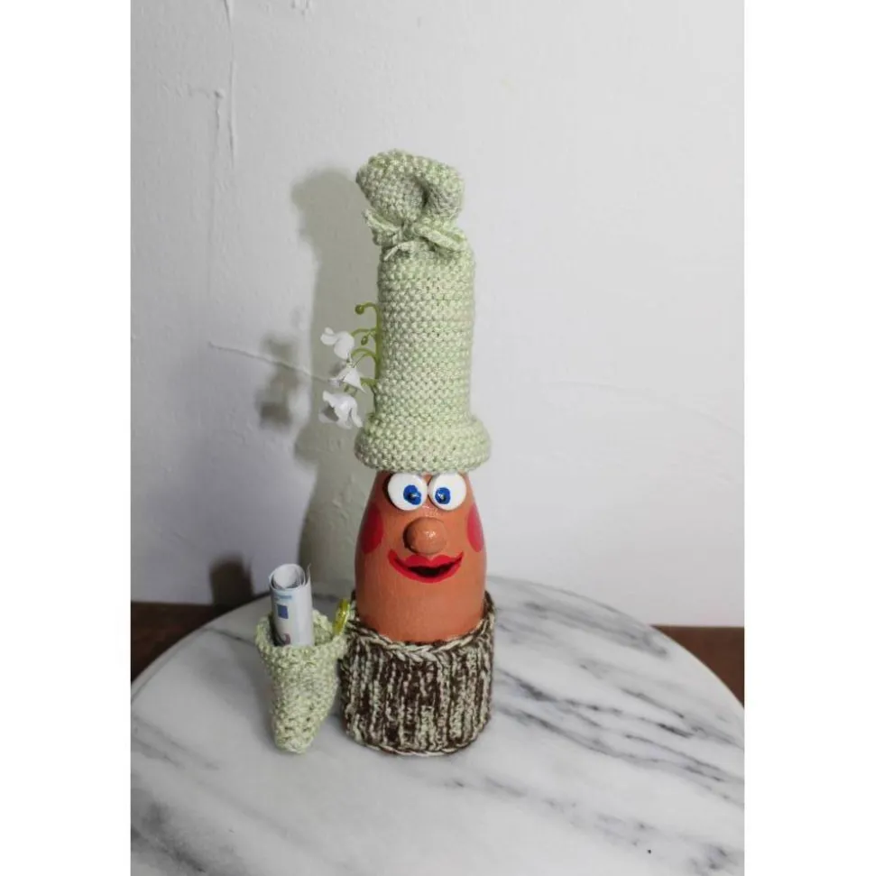 Witzige Figur aus einer Glasflasche. Upcycling-Projekt, gestaltet mit Acrylfarbe und handgestrickten Accessoires. Am Wollmützchen sind künstliche Blüten befestigt. Kann als Geldgeschenk verwendet werden, indem man einen Geldschein seitlich einsteckt :), siehe Beispielfoto.