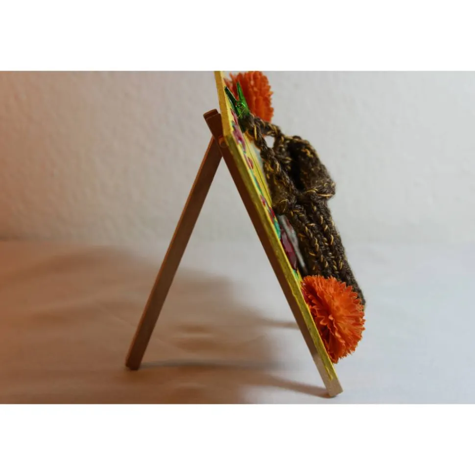 Leinwand, Holzstaffelei, Kunststoff, Wolle, Acrylfarben, Glitzersteine, Kunstblumen