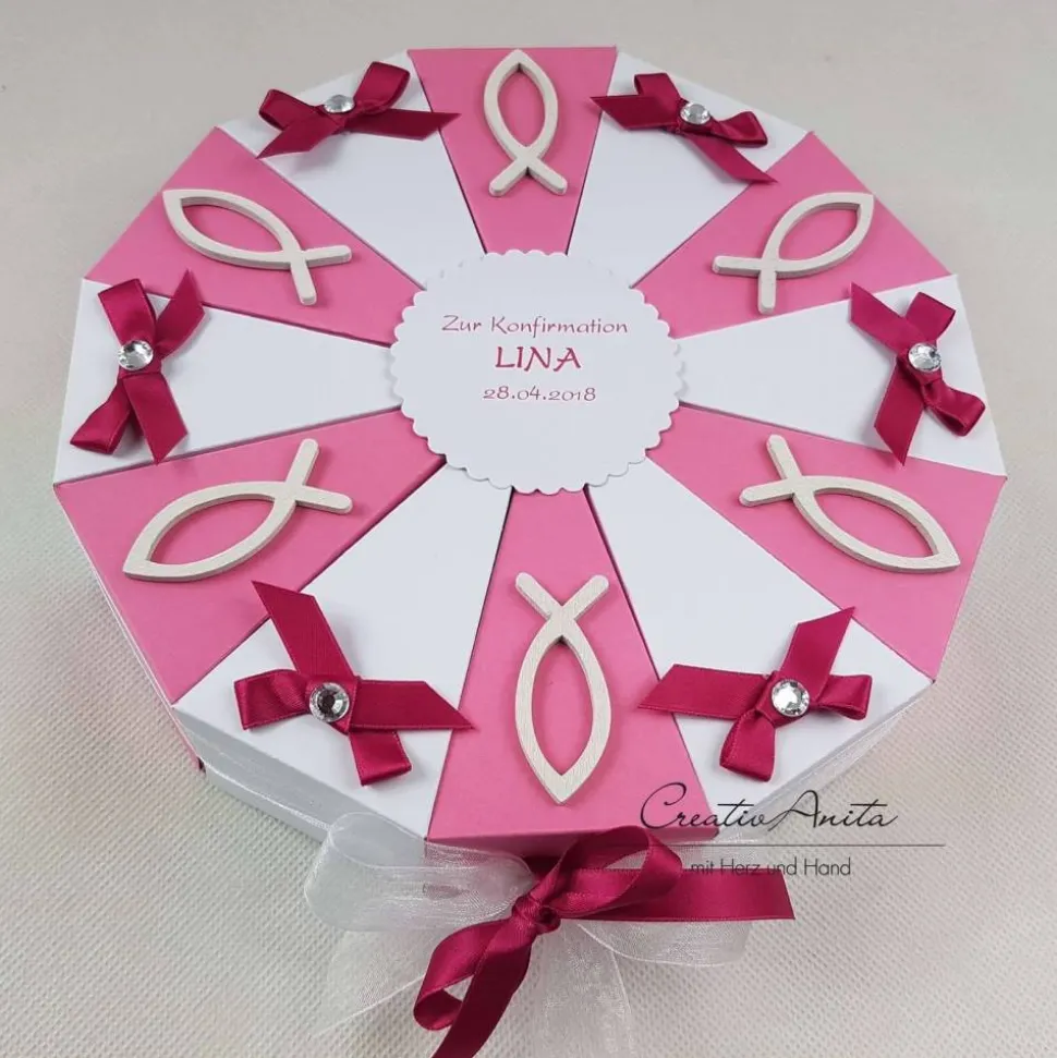 Material: kräftiger Tonkarton, Stanzelemente, Holzfische, Schleifenband, anlassbezogene Deko, beschriftbarer Aufleger