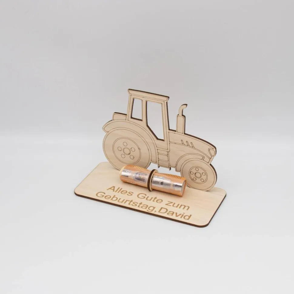 Hergestellt aus feinem Birkensperrholz, zeichnet sich unser Geldgeschenk durch seine natürliche Schönheit und Langlebigkeit aus. Das Herzstück bildet ein kunstvoll mit dem Laser geschnittenes Traktormotiv, das detailreich und präzise gearbeitet ist. Diese Technik ermöglicht nicht nur eine exakte Darstellung des Traktors, sondern verleiht dem Holz auch eine fein gearbeitete Textur.