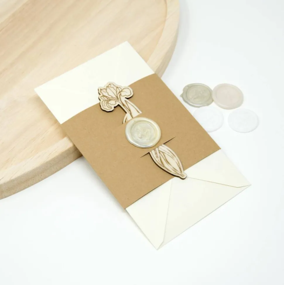 Ein Geldgeschenk zur Hochzeit, das so aussieht, als hätte man sich wirklich Gedanken gemacht. Weil man das auch hat. Dieses Set besteht aus einem Umschlag, einer Banderole, einem Wachssiegel mit Schwertlilien-Motiv und einem personalisierten Holzblume mit Lasergravur. Alles ist handgemacht und wird mit den Namen des Brautpaares sowie dem Hochzeitsdatum graviert. Der Umschlag ist für einen 50-Euro-Schein konzipiert (Geldschein ist nicht Teil des Produktes).