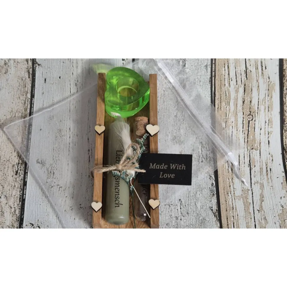 Die enthaltene Kerze in staubig grün (11cm) wird individuell mit einer Aufschrift deiner Wahl verziert, sodass du ein ganz persönliches Geschenk überreichst. Das Reagenzglas aus Kunststoff mit Korken (10cm) trägt die Aufschrift „Wunscherfüller“ und bietet Platz für einen Geldschein als kreative Überraschung.