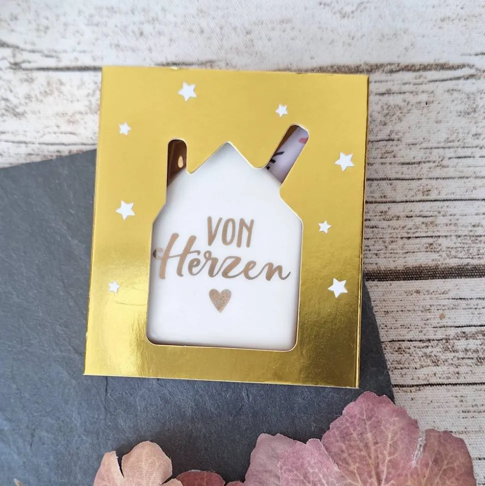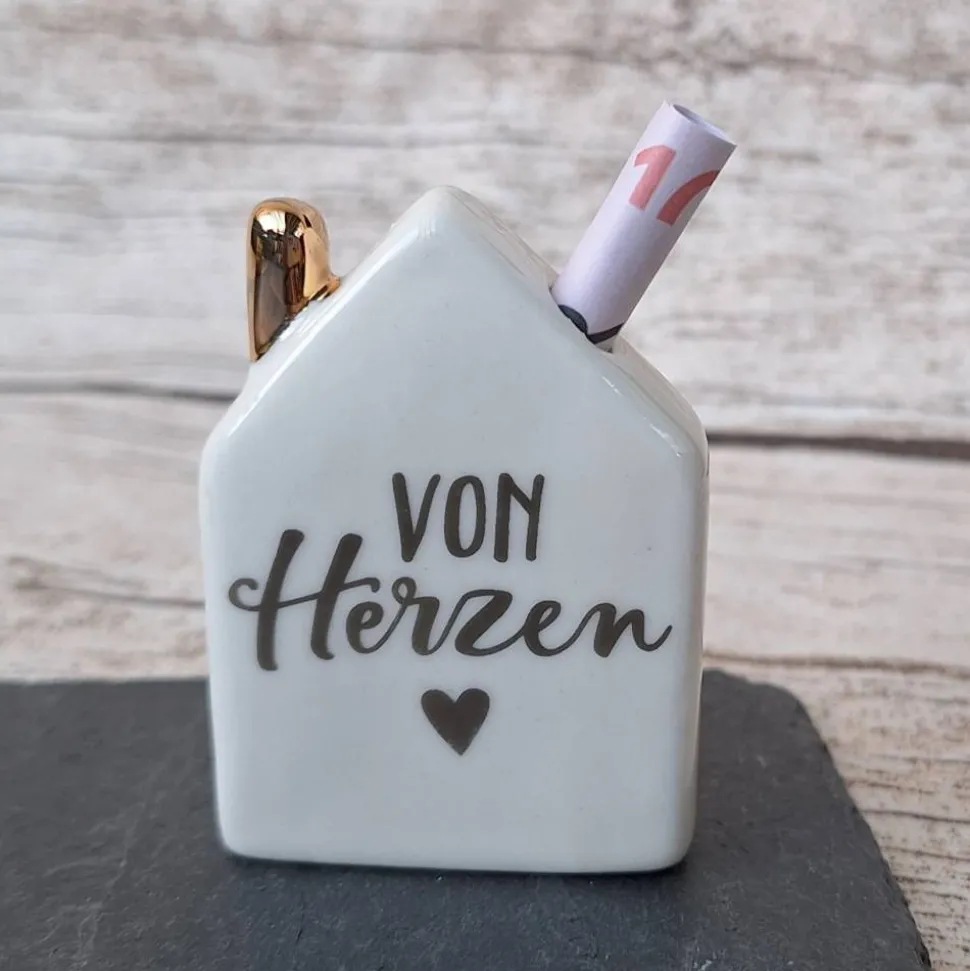 Das niedliche Porzellan-Haus ist mit goldfarbener Schrift bedruckt und bietet Platz für einen gerollten Geldschein. Geliefert wird es in einer goldenen Geschenkverpackung.