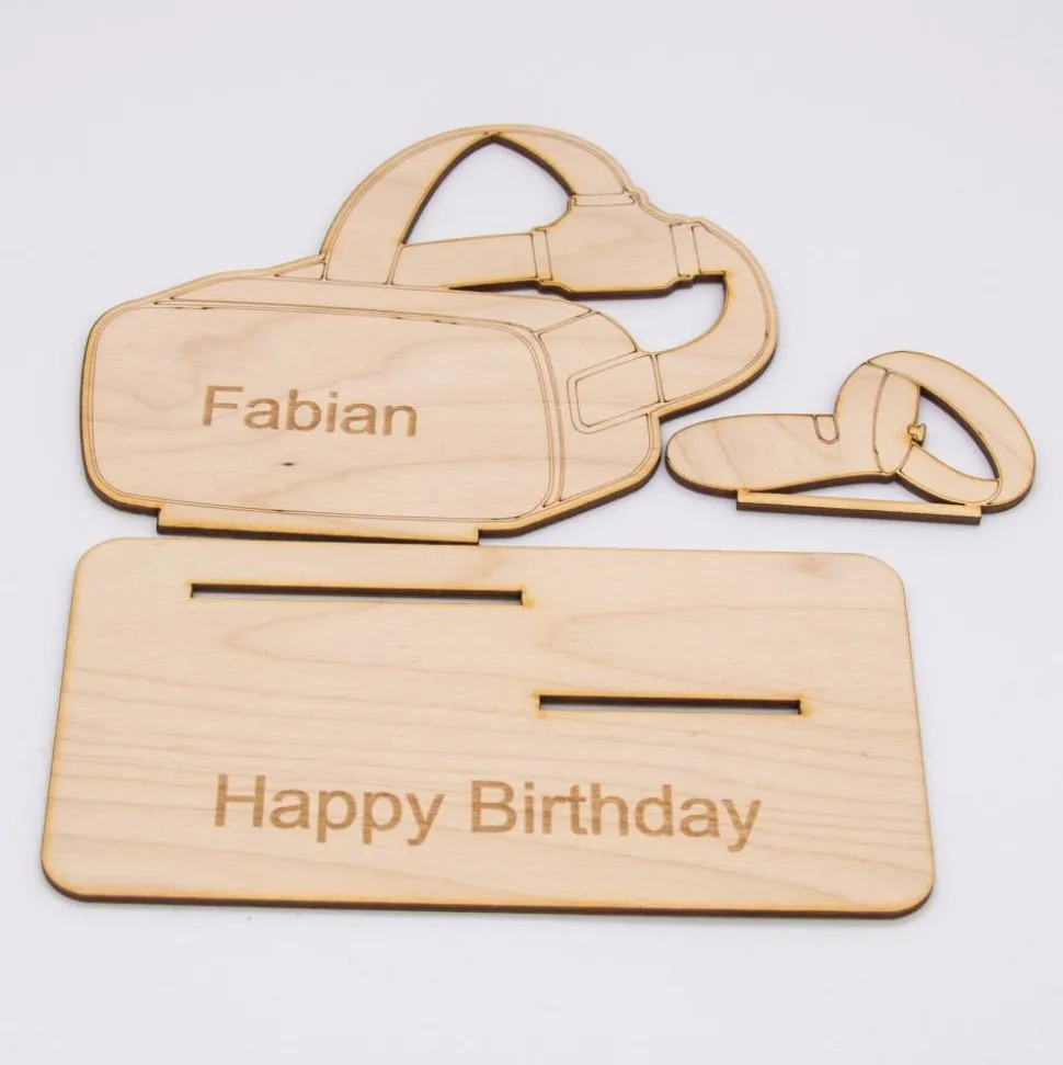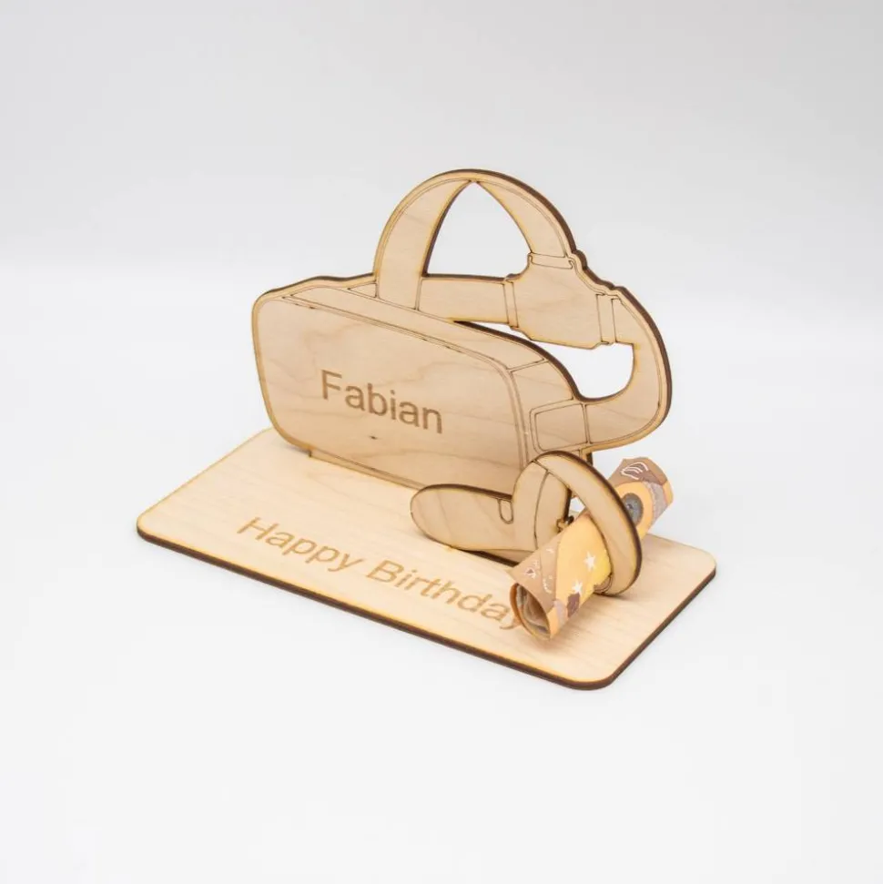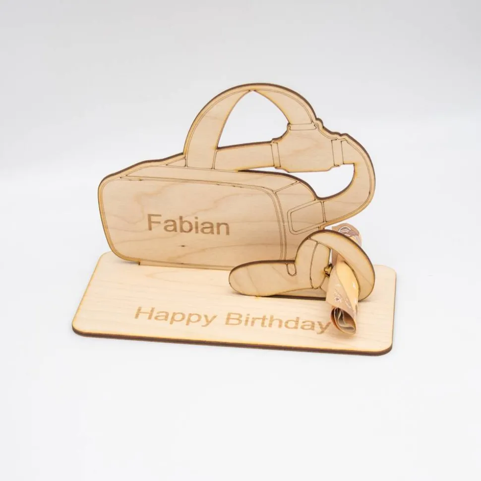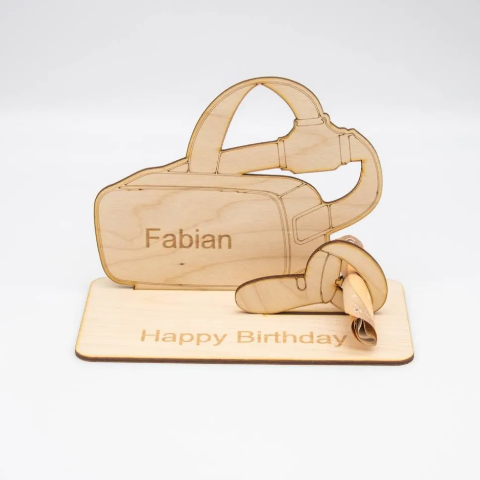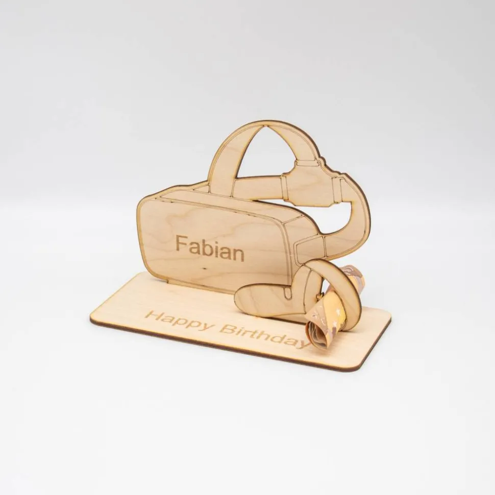 Unser einzigartiges Geldgeschenk aus 3 mm Birkensperrholz vereint Kreativität und Funktionalität in einem beeindruckenden Design. Dieses besondere Stück, sorgfältig gefertigt aus hochwertigem Birkensperrholz, besticht durch das detaillierte Motiv einer VR-Brille mit Controllern und ist das ideale Präsent für leidenschaftliche Gamer und Technik-Enthusiasten.