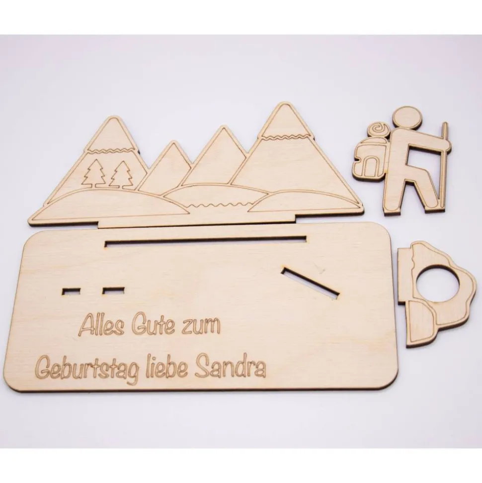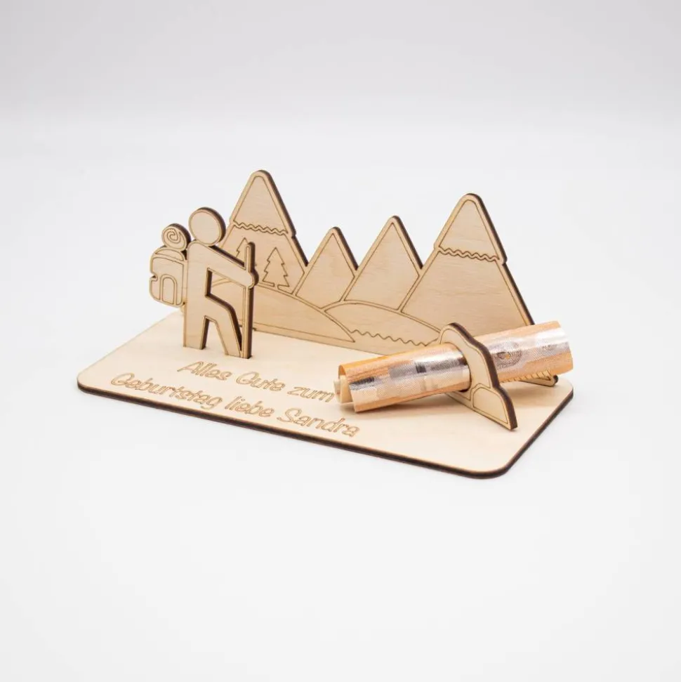 Mache dein Geschenk unvergesslich – wähle unser Holz Geldgeschenk mit Wander- und Bergmotiv, das ebenso einzigartig ist wie der Empfänger selbst!