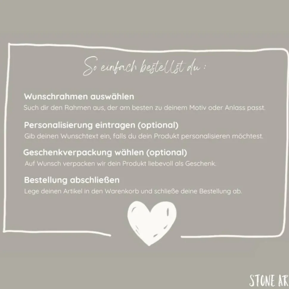 Individuelle Personalisierung: Gib deine Wünsche wie Namen, Farbwünsche oder spezielle Daten direkt im Personalisierungsfeld an. So wird dein Steinbild zu einem einzigartigen Geschenk, das ideal zu Weihnachten, aber auch zu Hochzeit, Verlobung oder Jahrestag passt.