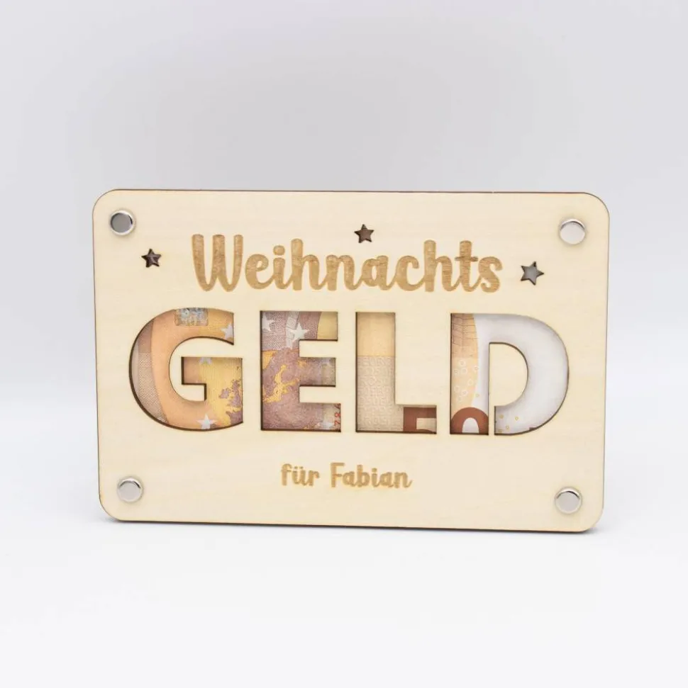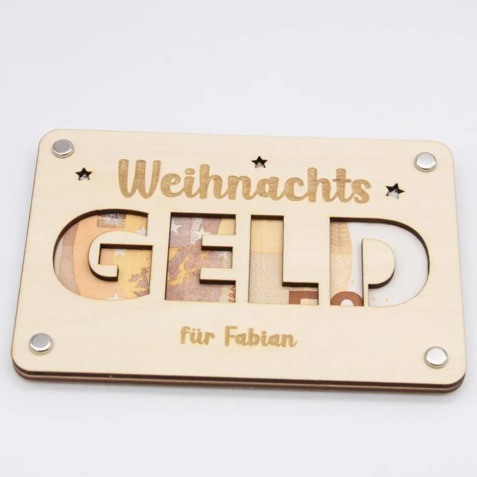 Auf der Vorderseite ist eine fein ausgelaserte Schriftzug zu sehen und etwas Weihnachtsgeld kann wohl jeder gebrauchen . Durch das Motiv schimmert der Geldschein hindurch und wird so stilvoll in Szene gesetzt. Unterhalb des Motivs kannst du noch einen Namen der beschenkten Person eingravieren lassen.