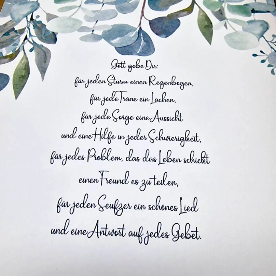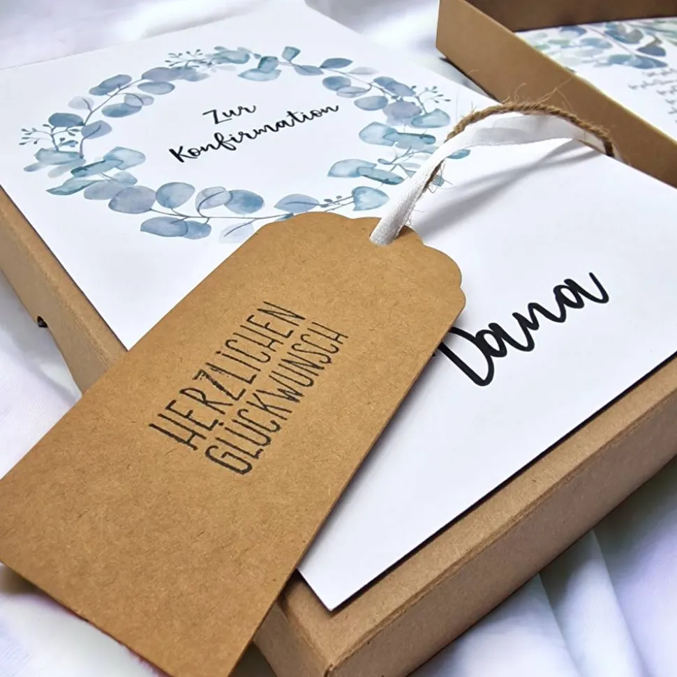 Die Verpackung wird personalisiert mit dem Namen des Beschenkten, den Namen der Gratulanten sowie der Art des Anlasses. Wenn gewünscht, können Sie auch den Text selbst aussuchen. Andernfalls trage ich gerne den von mir ausgesuchten Text ein. Auf dem Foto können Sie sich den von mir ausgewählten Text ansehen.