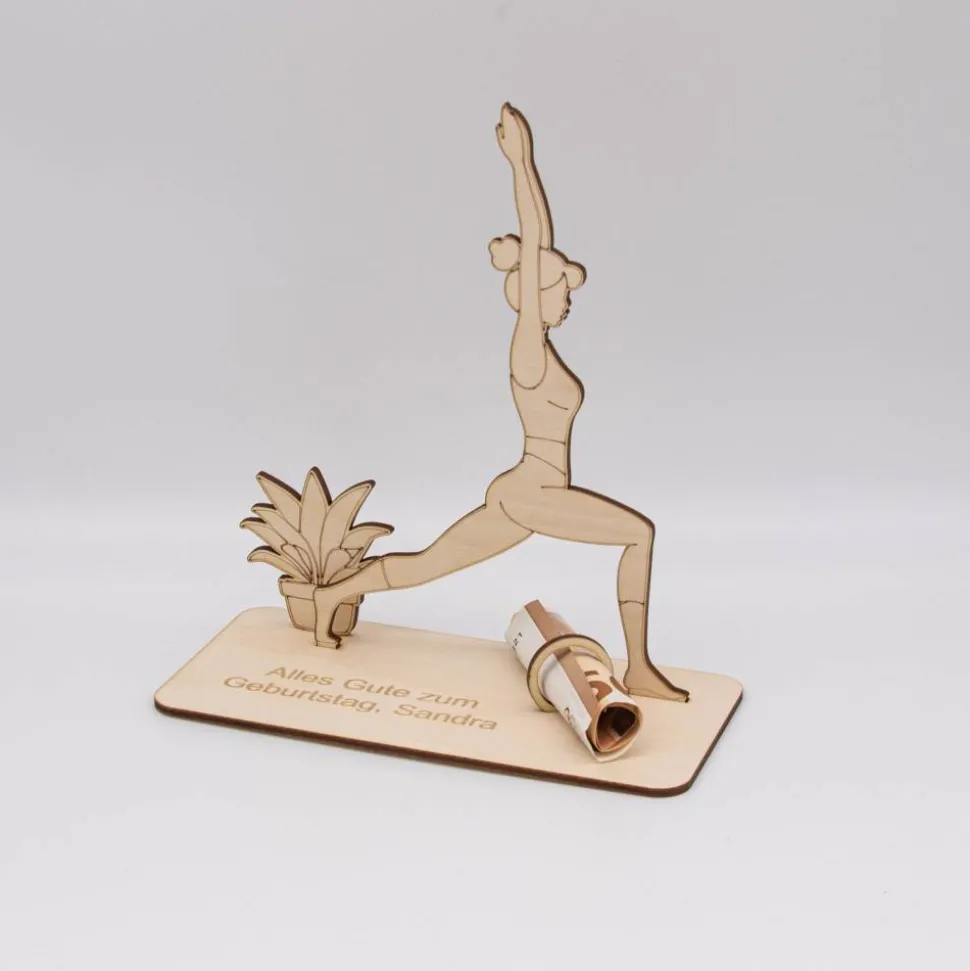 Entdecken Sie die perfekte Kombination aus Eleganz und Funktionalität mit unserem handgefertigten Geldgeschenk, das aus hochwertigem 3mm Birkensperrholz sorgfältig geschnitzt wurde. Dieses einzigartige Kunstwerk stellt eine anmutige Frau dar, die in einer entspannenden Yoga-Pose verweilt. Es ist nicht nur ein wunderschöner Dekorationsgegenstand, sondern bietet auch eine kreative Möglichkeit, Geldgeschenke zu präsentieren.
