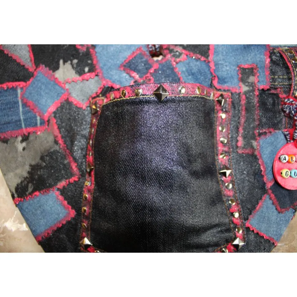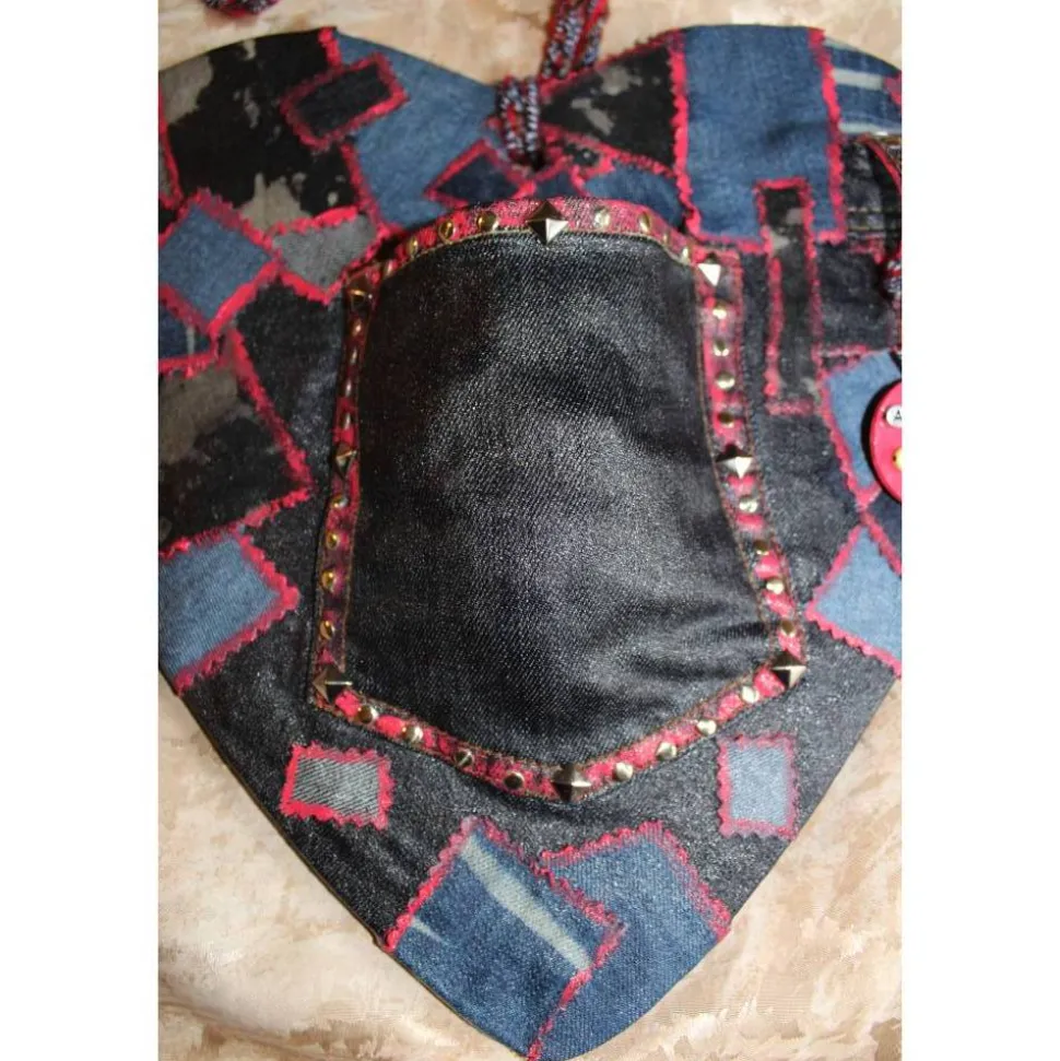 Collage aus Jeans, abstrakt gestaltet auf einem herzförmigen Bambusbrett. Bemalt mit Acrylfarben.