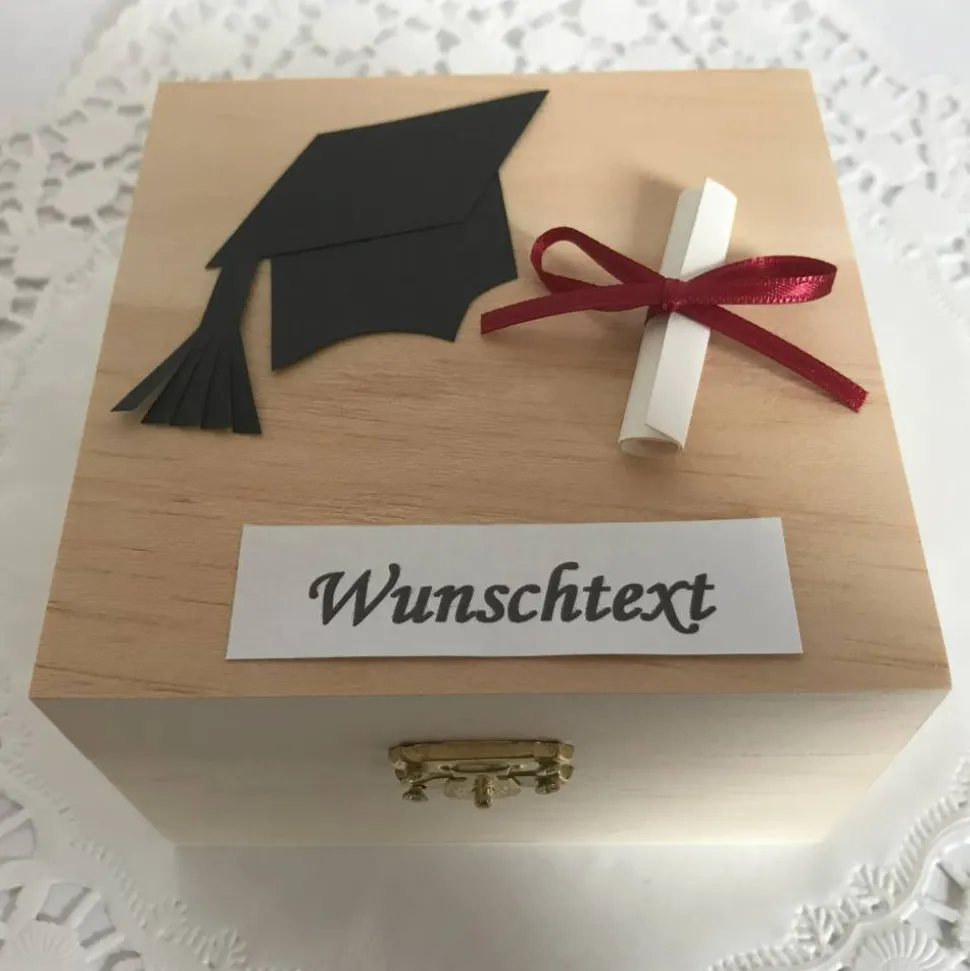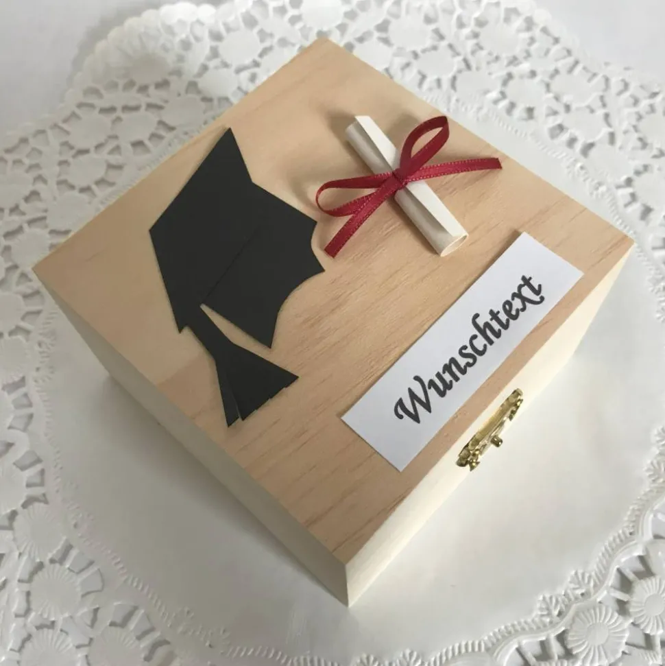 Dekoriert ist die Holz-Box mit Doktorhut sowie Abschluss-Zeugnis. Farblich sowohl für den Mann als auch die Frau geeignet. In der praktischen Schatulle aus Holz lässt sich ein Gutschein ebenso als Geschenk überreichen wie Geld in Münzen oder Scheinen. Besonderes Highlight ist das Schild mit Wunschtext wodurch das Geldgeschenk noch persönlicher gestaltet werden kann.