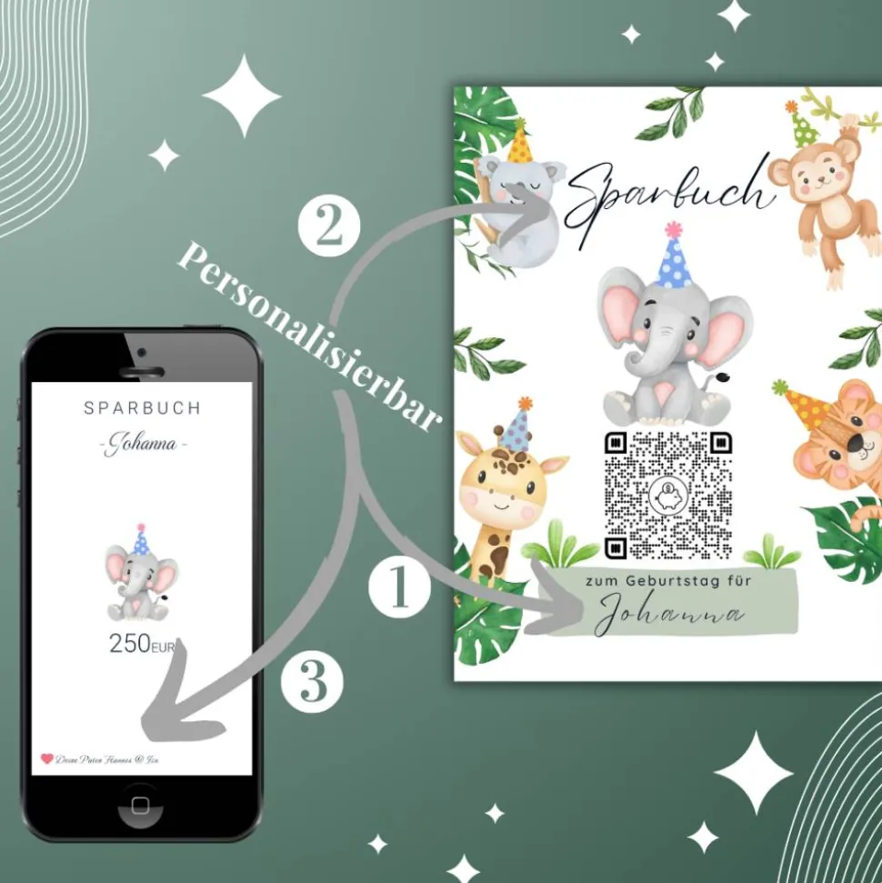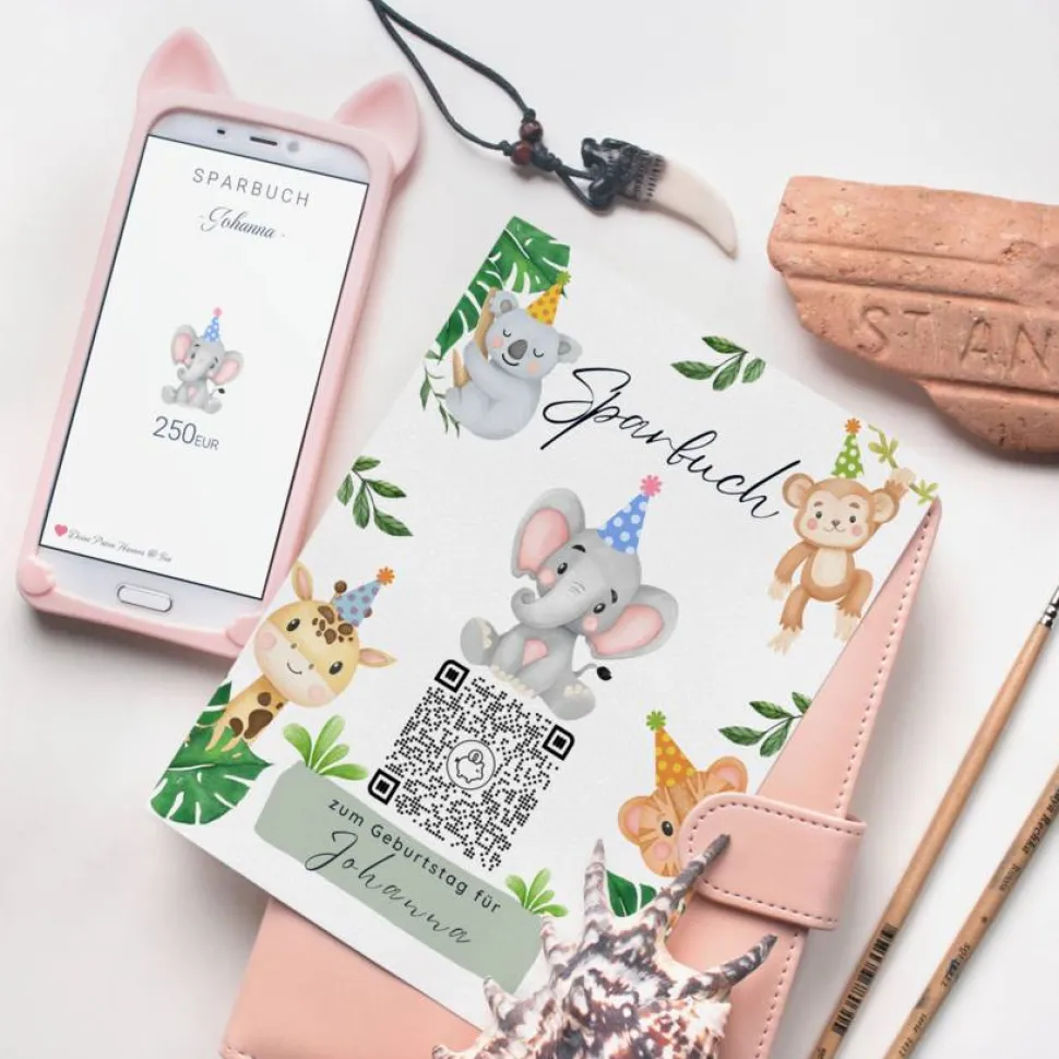 Geldgeschenk zum Geburtstag | Personalisiert | Digitale Spardose | QrCode Geschenkkarte | Party Elefant