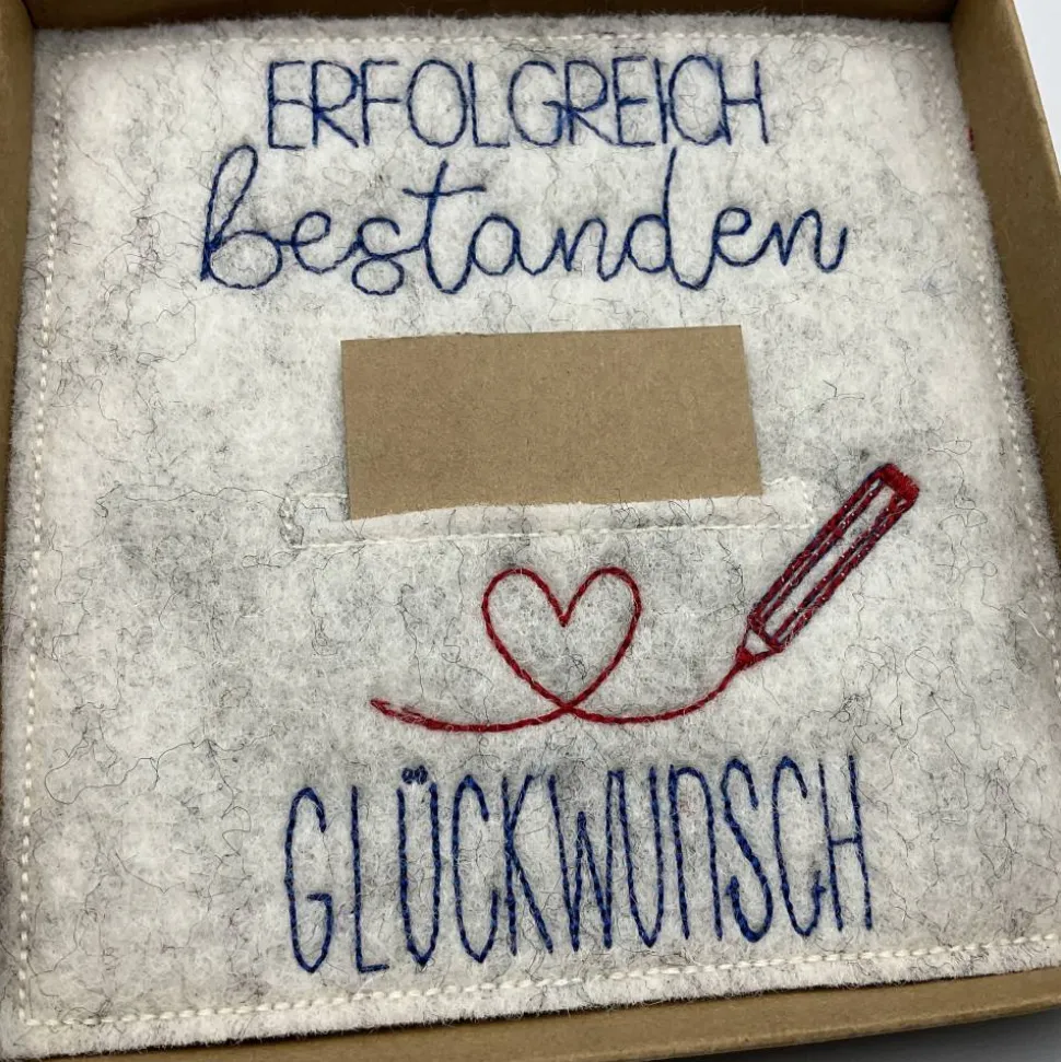 Im Inneren eine bestickte Filzkarte mit Einschub für Geld oder eine Botschaft, oder Beides!