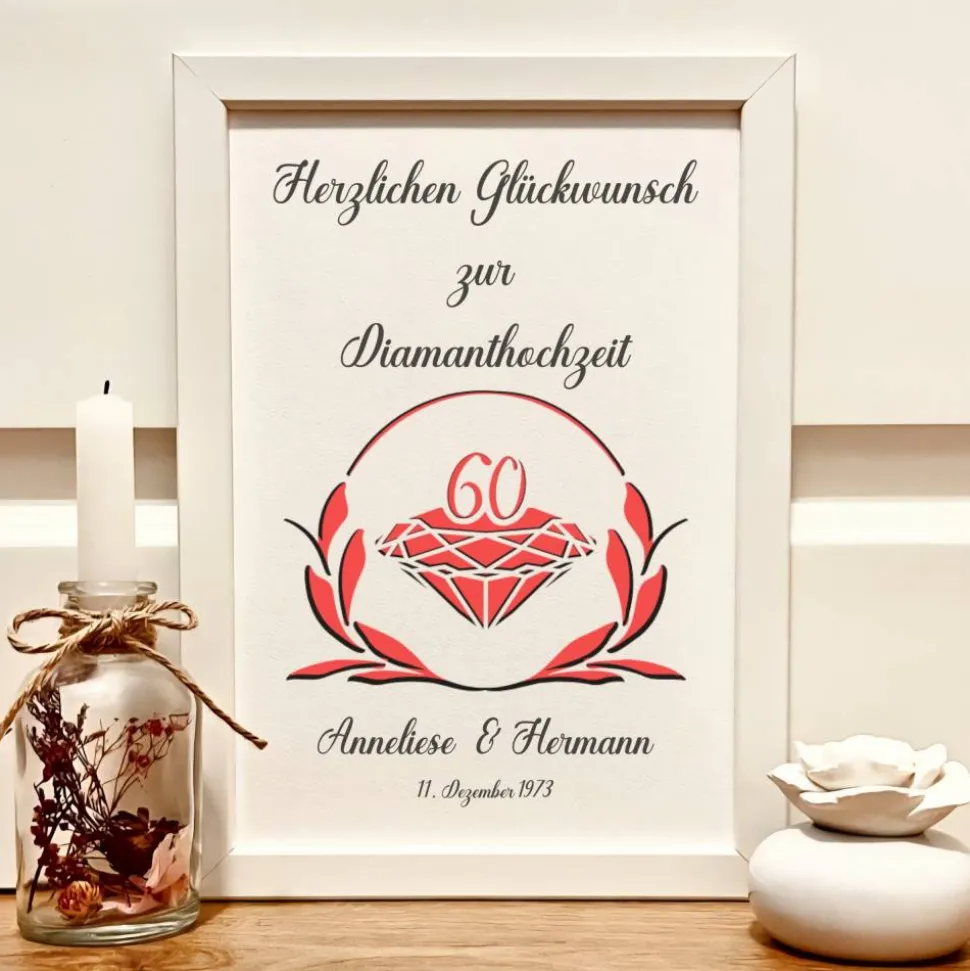 Das stilvolle A4 Bild aus 300g Strukturkarton wird mit den Namen des Jubelpaares und dem Hochzeitsdatum personalisiert. Ein aufgedruckter Diamant mit der Zahl 60 sowie der Schriftzug „Herzlichen Glückwunsch zur Diamanthochzeit“ machen dieses Präsent zu einem exklusiven Unikat.