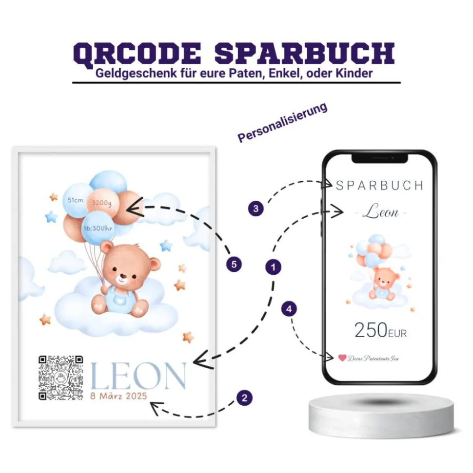 Geldgeschenk zur Geburt | Digitales Sparbuch | Personalisiertes QrCode Bild | Motiv Geburt Blau