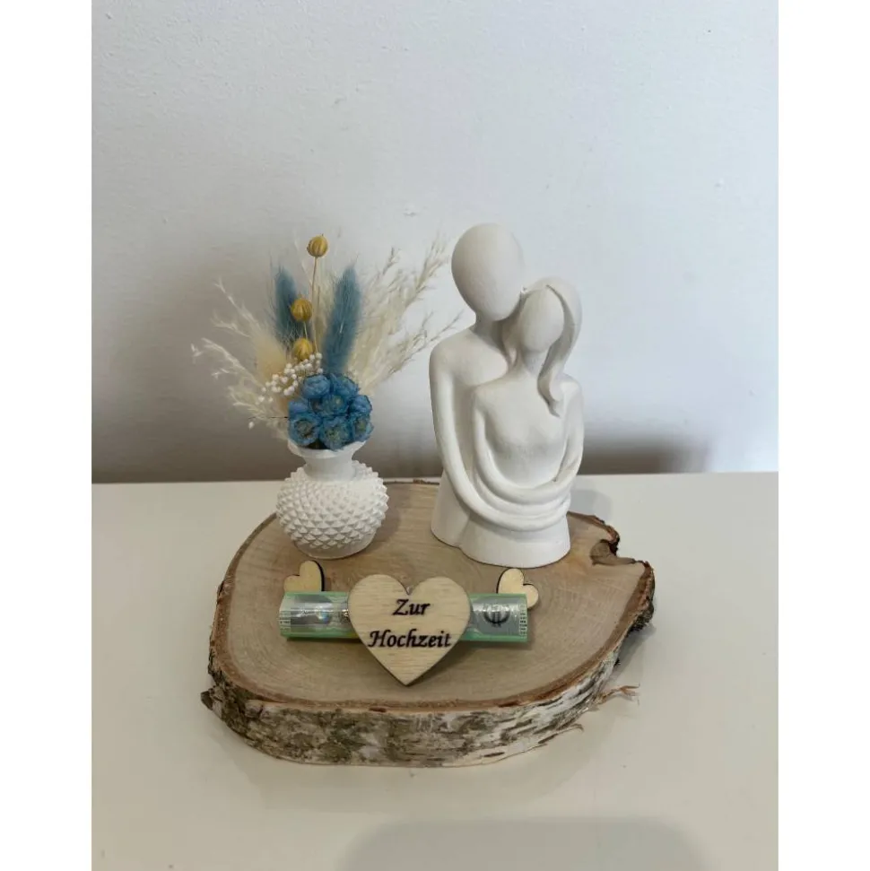 Das schöne Geldgeschenk besteht aus einer Baumscheibe und wurde mit einem Pärchen und einer Vase mit Trockenblumen verziert 🙂 Hinter dem Herz ist eine Spirale worin man das Geld hineinschieben kann.