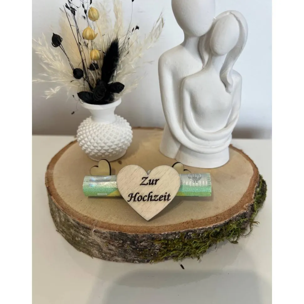 Das schöne Geldgeschenk besteht aus einer Baumscheibe und wurde mit einem Pärchen und einer Vase mit Trockenblumen verziert 🙂 Hinter dem Herz ist eine Spirale worin man das Geld hineinschieben kann.