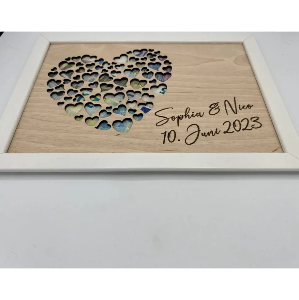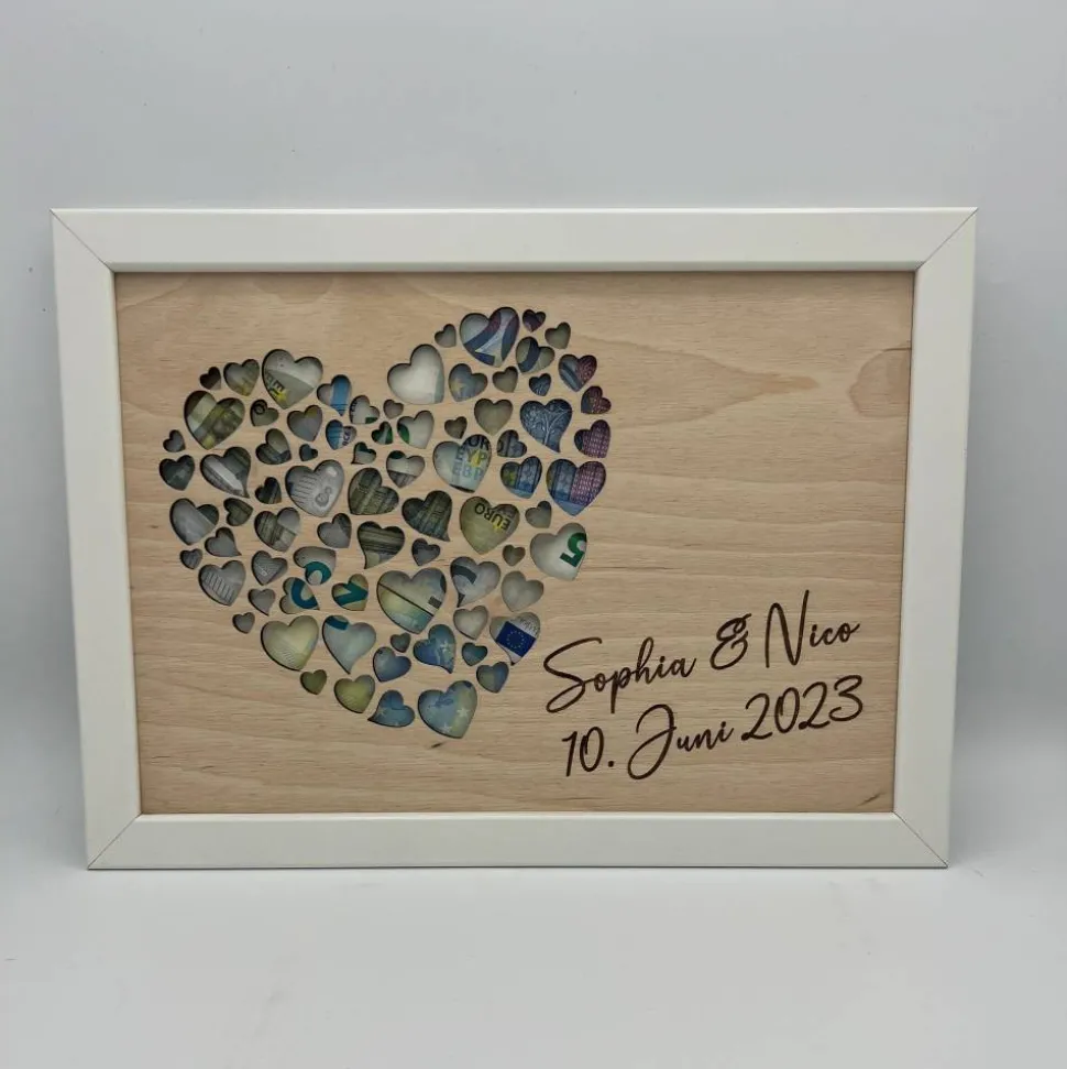 Verschenke ein Geldgeschenk, das von Herzen kommt! Unser personalisierter Bilderrahmen aus Holz ist das perfekte Geschenk für Hochzeiten, Geburtstage, Taufen und viele weitere Anlässe. Mit einer hochwertigen 3mm starken Birkenholzplatte und einem großen Herzmotiv setzt du dein Geldgeschenk stilvoll in Szene.