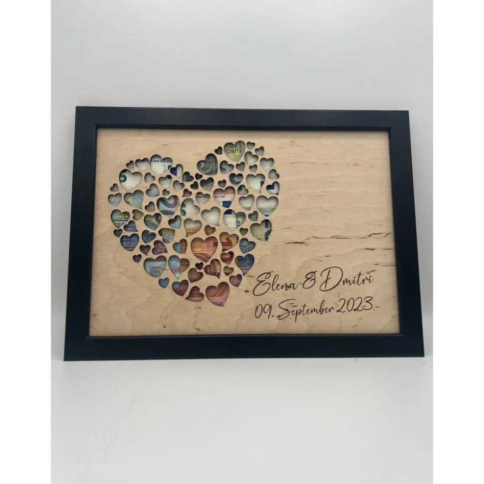 Die flexible Dekorplatte erlaubt es dir, Geldscheine hinter dem Herzmotiv anzubringen, sodass ein einzigartiges, farbenfrohes Design entsteht. Auch nach der Entnahme des Geldes bleibt der Rahmen als zeitlose Wanddekoration ein echter Blickfang.