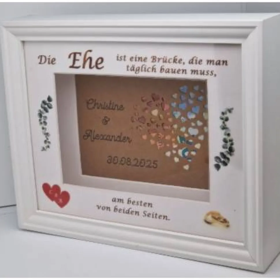 Überrasche das Brautpaar mit einem einzigartigen Geldgeschenk zur Hochzeit: Der personalisierte Bilderrahmen in Weiß mit den Maßen 25 x 20 x 6 cm verbindet stilvolles Design mit emotionalem Erinnerungswert. Die individuelle Beschriftung mit den Namen des Brautpaares und dem Hochzeitsdatum macht dieses Präsent zu einem unvergesslichen Andenken.
