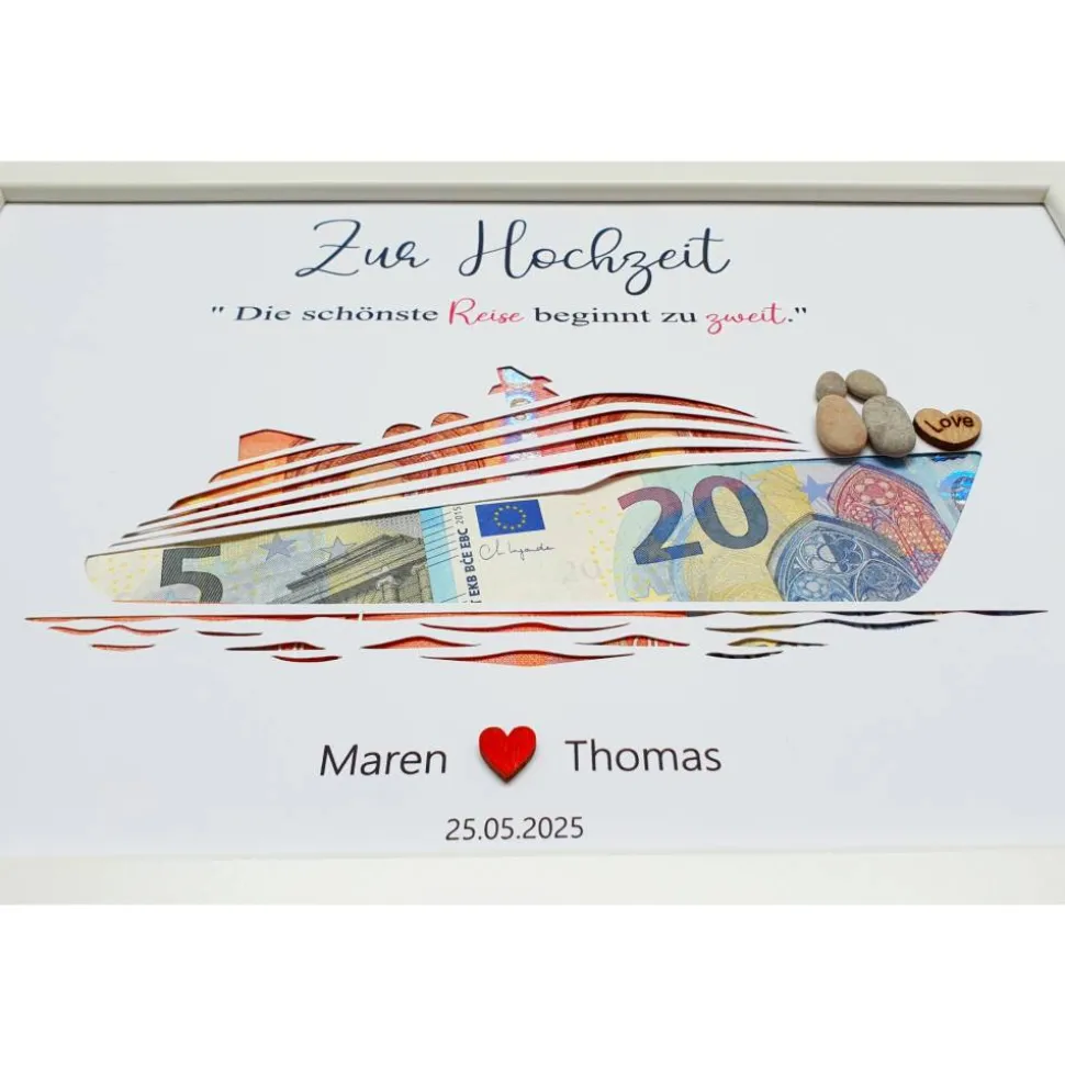 Überrasche ein Hochzeitspaar mit einem einzigartigen Geldgeschenk zur Hochzeit! Das handgefertigte Kieselsteinbild ‚Hochzeitsschiff‘ vereint persönliche Note und Exklusivität. Der hochwertige Bilderrahmen ist eine bleibende Erinnerung und eignet sich ideal als Hochzeitsgeschenk für Reisen, Kreuzfahrt oder Flitterwochen.