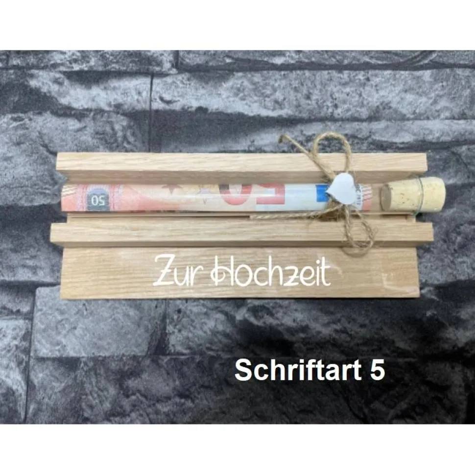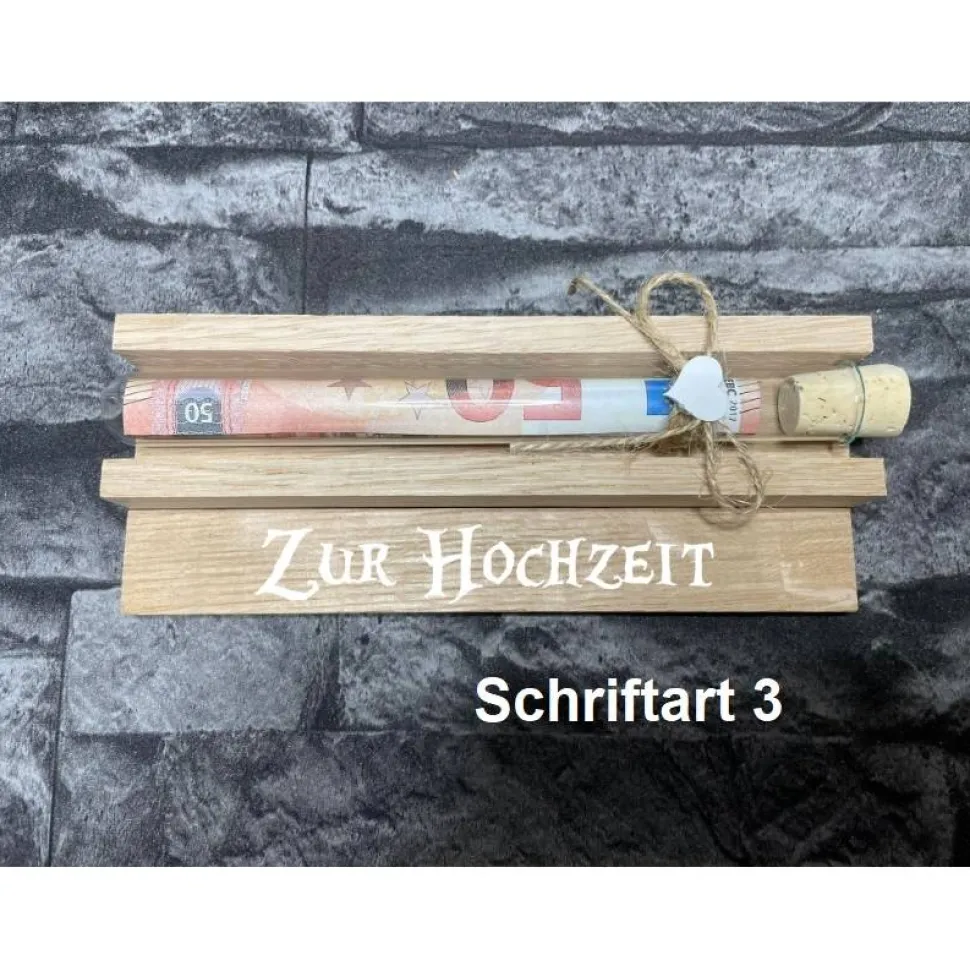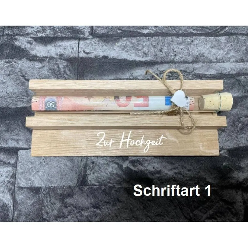 Geldgeschenk • Zur Hochzeit • Reagenzglas • Geschenkverpackung aus Holz • Eiche • Klötzchen