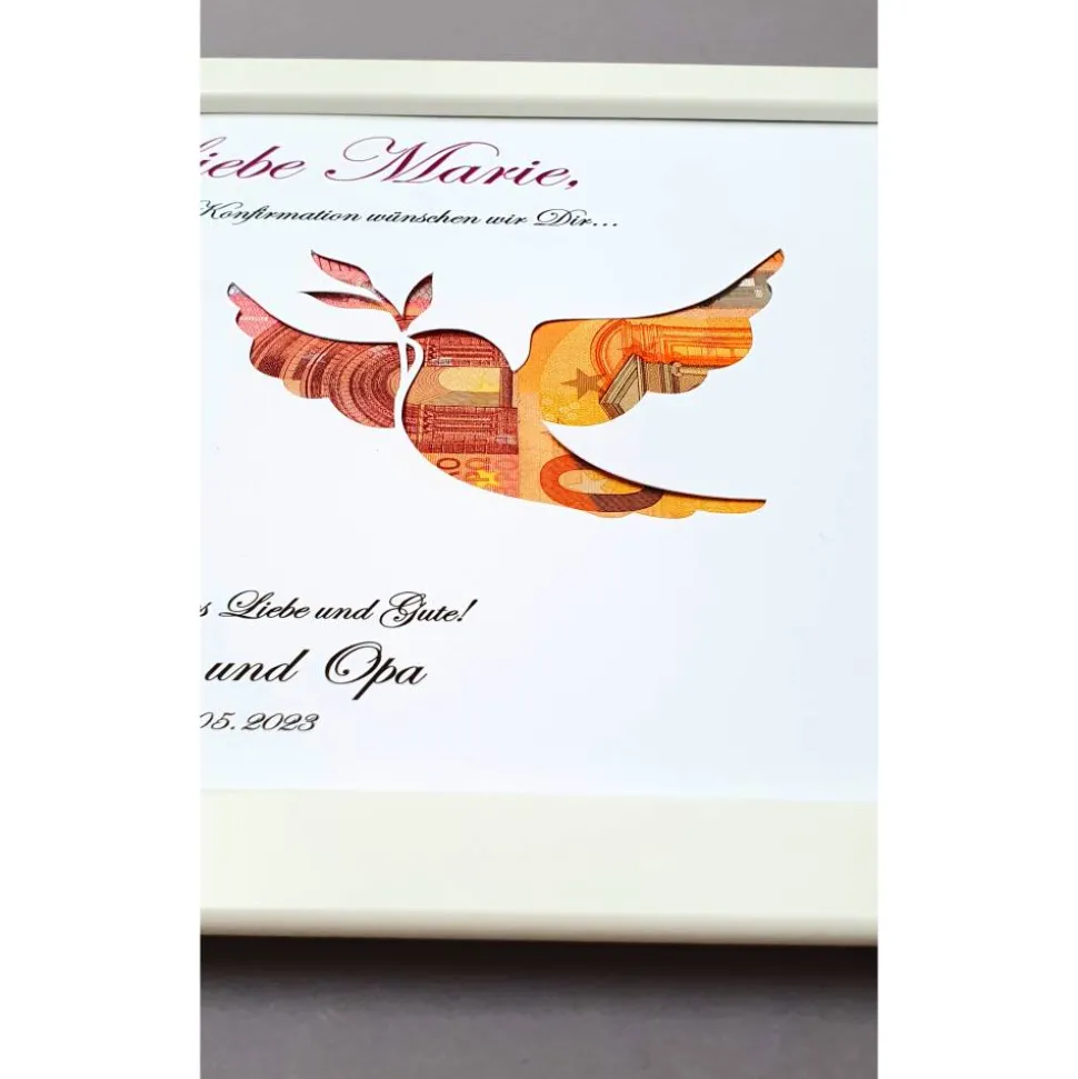 Den gewünschten Geldbetrag können Sie einfach zwischen dem Bild und dem grauen Karton hinterlegen.