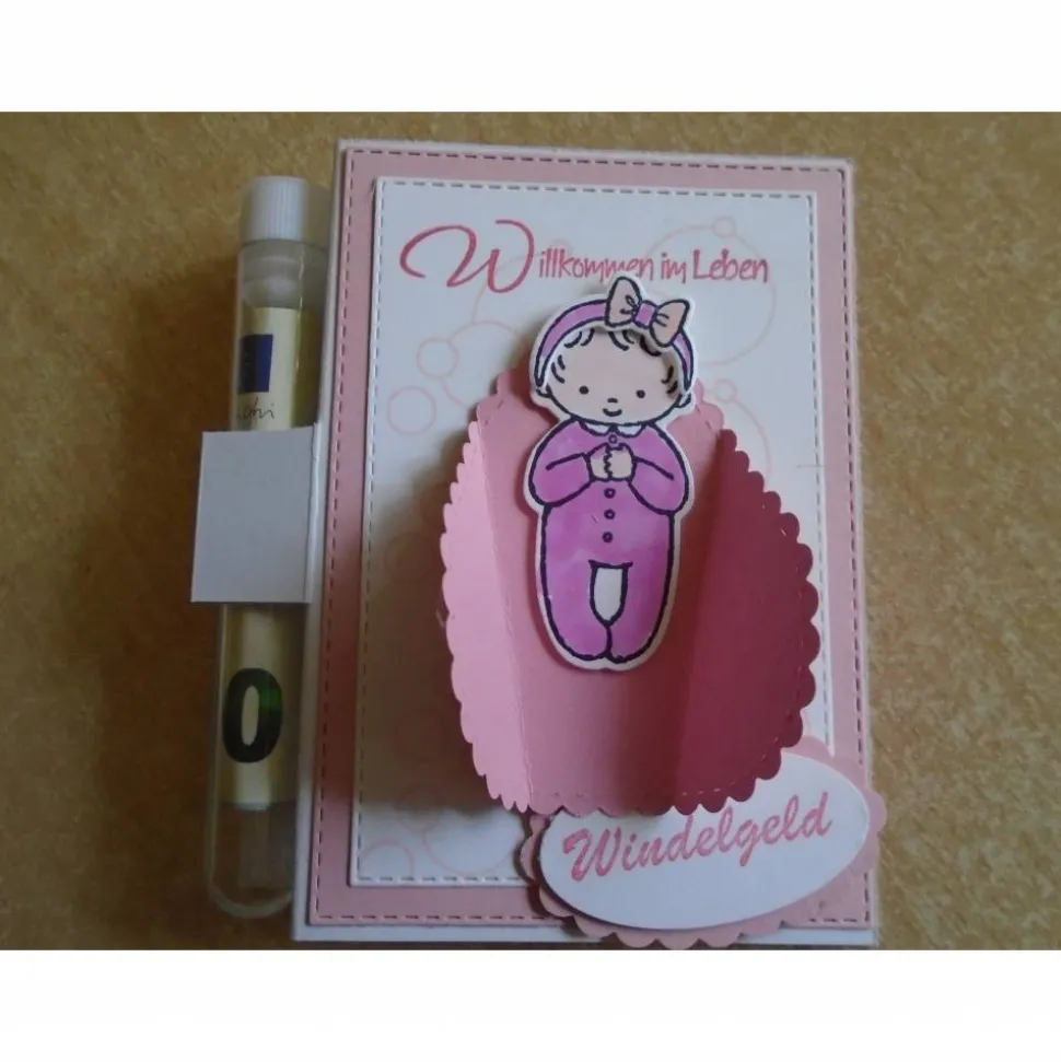 Verziert wurde diese Geldkarte zur Taufe Geburt ein Reagenzglas,stanzer,Stempel Windelgeld..