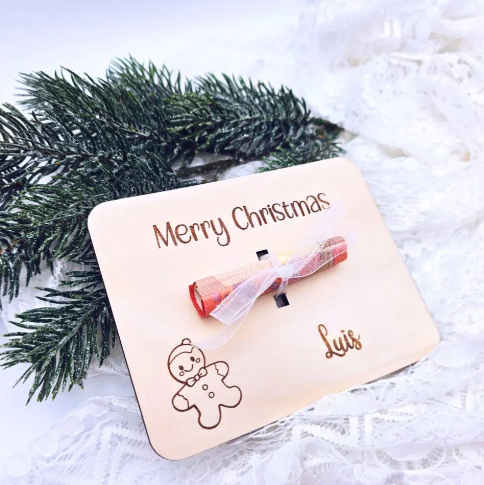 Entdecke unsere Geldgeschenk-Karte aus Holz, die ideale Geschenkidee zu Weihnachten. Diese handgefertigte Karte bietet Platz für Geld oder Gutscheine. Ein kleines Weihnachtsgeschenk, das mit seiner hochwertigen Verarbeitung und dem festlichen Design besticht. Ob als Hauptgeschenk oder als besondere Ergänzung zu anderen Geschenken – unsere Holzkarte wird deine Liebsten garantiert erfreuen. Sie eignet sich perfekt als kreativer Gutschein oder für individuelle Geldgeschenke und ist eine stilvolle und nachhaltige Option, um deine Weihnachtswünsche zu übermitteln.
