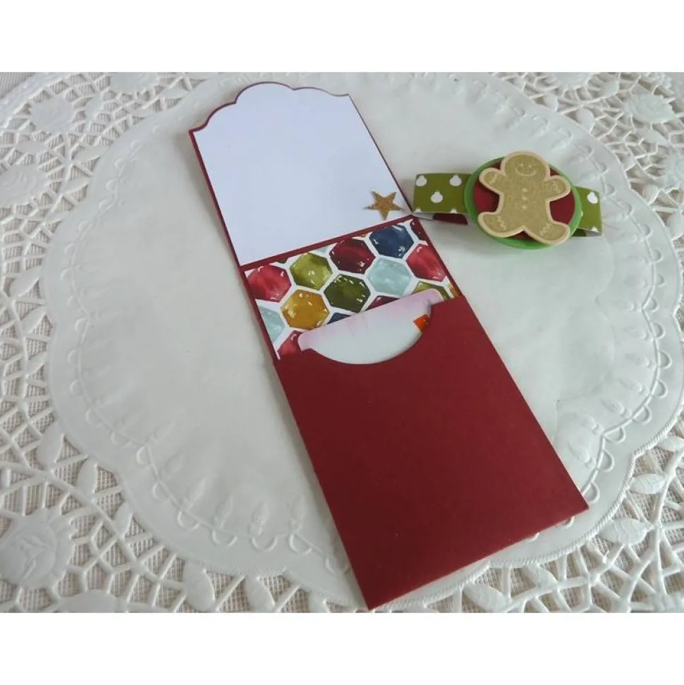 Gefertigt aus weinrotem Tonkarton und schönem Designerpapier, geschlossen wird die Verpackung mit einer schön gestalteten Banderole, im Inneren auf der Klappe gibt es noch die Möglichkeit ein paar persönliche Worte zu schreiben.